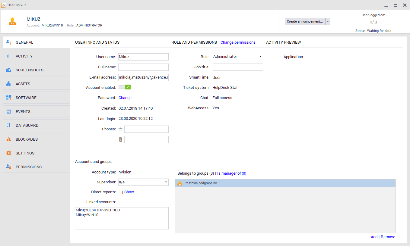 After selection of user from the list, you can navigate to the user information screen. This program area provides basic information about the selected person. The following account attributes can be identified: •User – the name under which the user can log in to the nVision console and to the HelpDesk module, •Full name, •E-mail address, •Desk (and mobile) phone number, •Role – user roles are described in chapter Types of user roles. •Title, •Group membership – allows to view the groups which the selected user is a member of, •Superior – user that is higher in the hierarchy than the currently selected person. A person who has subordinates will have access to the activity data for each of their subordinates in the SmartTime module, •Attachments – additional attachments related to the selected user. In addition, the user information screen provides information about user rights in various areas of the program. For accounts created in nVision, you may modify all the above-mentioned attributes.
