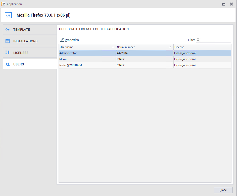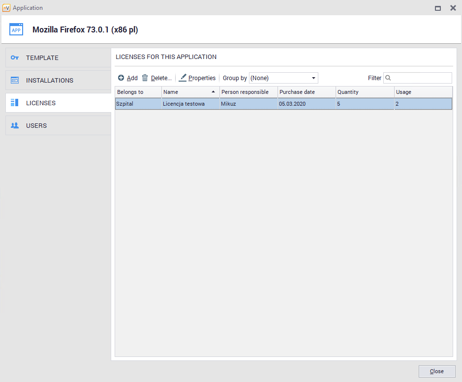 To edit applications, go to the Assets tab visible in the main program window, then double-click on any item on the Applications list in the Software section. Licenses Licenses tab allows to display a list associated with selected application: