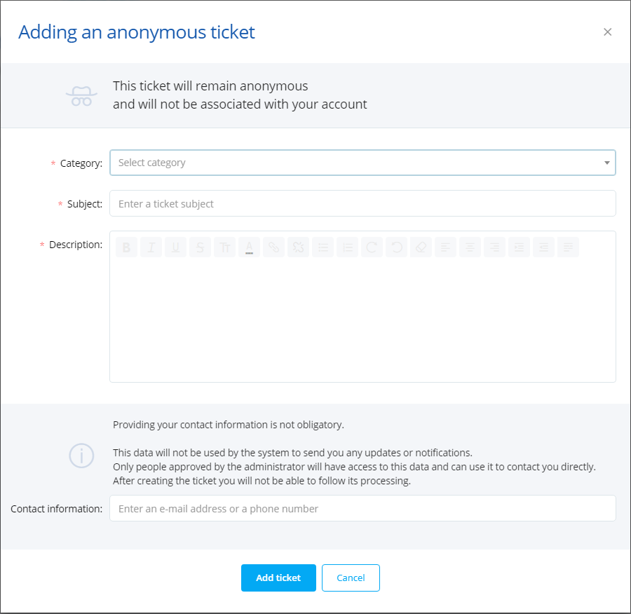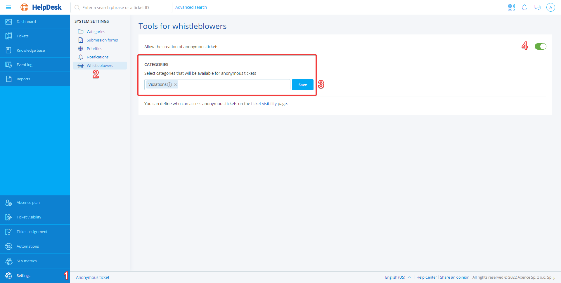 3. In the anonymous ticket setting panel, the category created in the HelpDesk, Violations (with description - Anonymous violation tickets), is automatically assigned to anonymous tickets.
