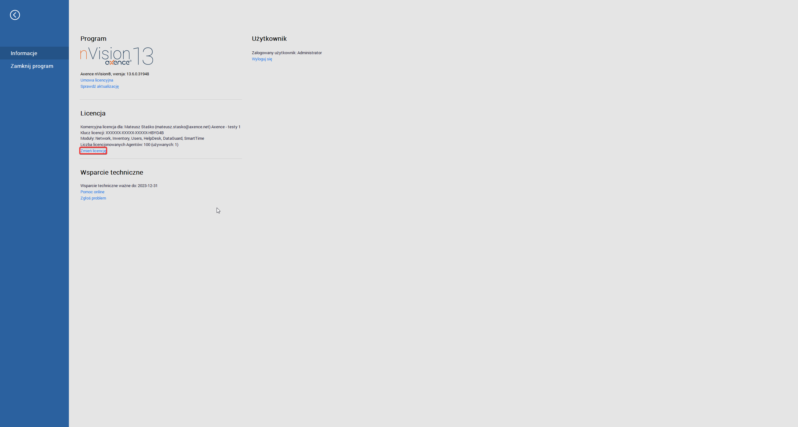 Aby zalogować się w programie do konta Axence, należy w lewym górym rogu ekranu wybrać zakładkę Axence nVision, a następnie w sekcji Licencja kliknąć przycisk Zmień licencję.