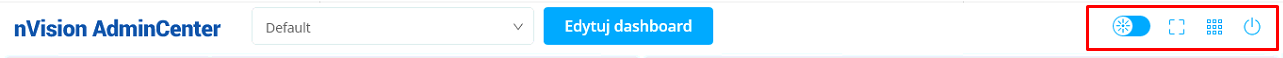 Poniżej znajduje się opis poszczególnych przycisków (począwszy od lewej): •Przełączenie motywu kolorystycznego AdminCenter (motyw jasny lub motyw ciemny), •Uruchomienie trybu pełnoekranowego, •Przełączenie między innymi aplikacjami webowymi nVision (HelpDesk, SmartTime), •Wylogowanie aktualnie zalogowanego użytkownika. |