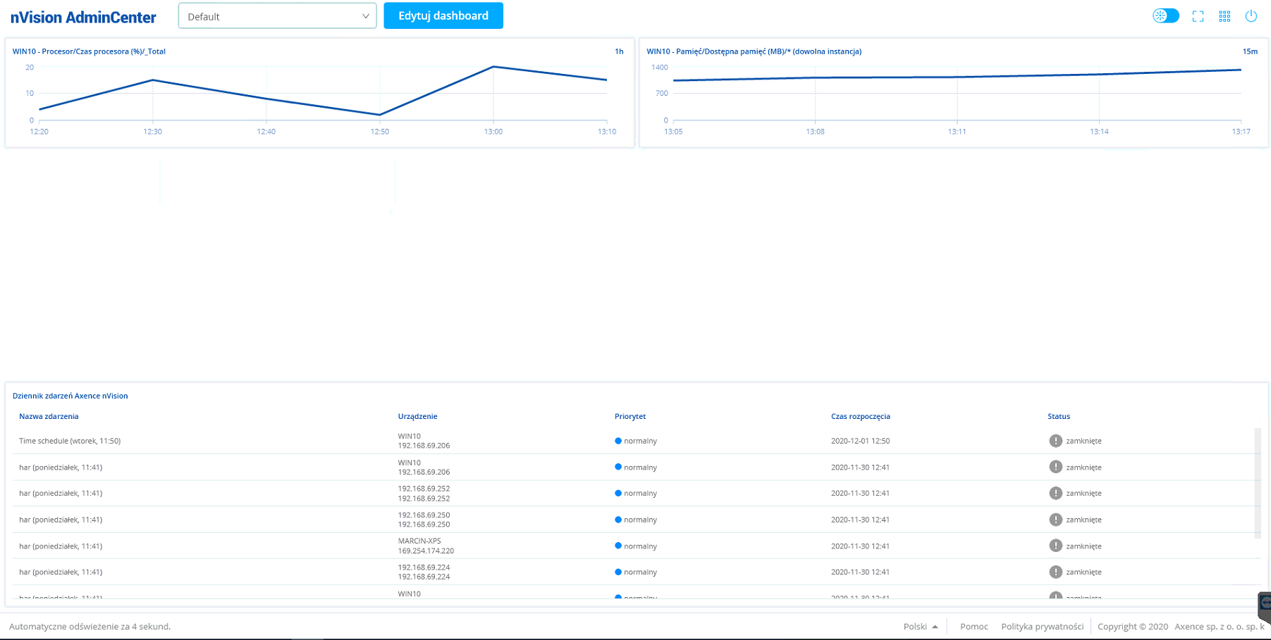 Przyciski nawigacyjne znajdują się w górnej części okna przeglądarki. Począwszy od lewego górnego rogu ekranu, widoczne jest pole mówiące o tym jaki dashboard jest obecnie wyświetlany. Klikając przycisk Edytuj dashboard możliwe jest przejście do trybu edycji wybranego dashboardu. Edytowanie dashboardów zostało szczegółowo opisane w kolejnym rozdziale.