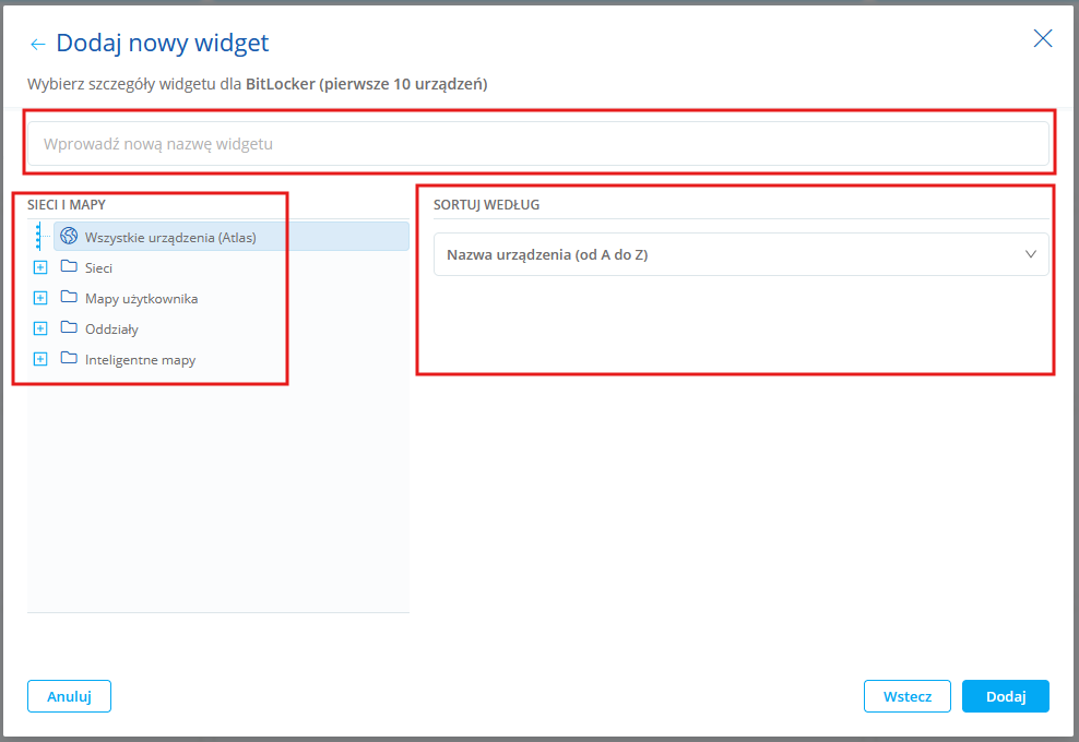 BitLocker (pierwsze 10 urządzeń) Lista pierwszych dziesięciu urządzeń z BitLockerem. Możesz wybrać: •mapy sieci, •regułę sortowania. Przykład: