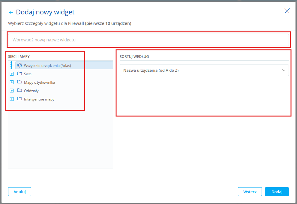 Firewall (pierwsze 10 urządzeń) Lista pierwszych dziesięciu urządzeń z firewallem. Możesz wybrać: •mapy sieci, •regułę sortowania.