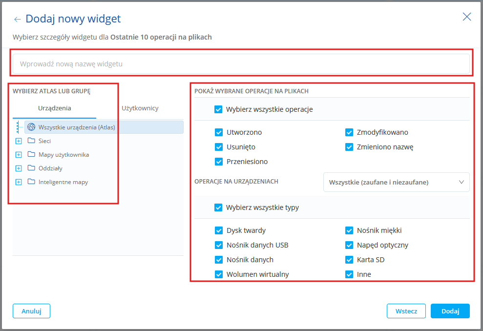 Ostatnie 10 operacji na plikach Lista ostatnich dziesięciu operacji dokonanych na plikach. Możesz wybrać: •oddział lub mapy sieci albo grupy użytkowników, •rodzaj operacji na plikach (utworzono, zmodyfikowano, usunięto, przeniesiono lub zmieniono nazwę), •typ urządzenia przenośnego.