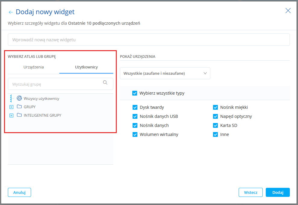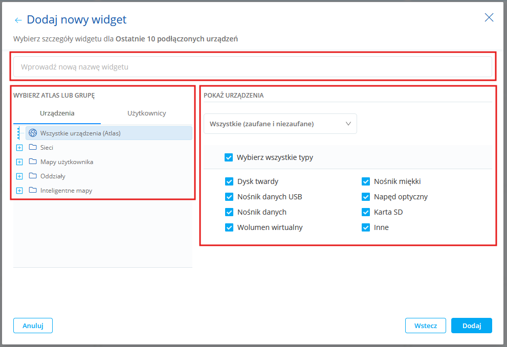Ostatnie 10 podłączonych urządzeń Lista ostatnich dziesięciu urządzeń podłączonych do komputerów z Agentami. Możesz wybrać: •oddział lub mapy sieci albo grupy użytkowników, •rodzaj urządzenia (zaufane, niezaufane, wszystkie), •typ urządzenia (dysk twardy, dyskietka itp.).