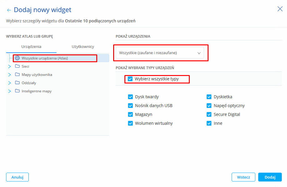 Ostatnie 10 podłączonych urządzeń Widżet prezentuje listę ostatnich 10 podłączonych do komputerów z Agentami urządzeń. Konfiguracja wymaga od użytkownika wybrania oddziału lub mapy sieci, dla których zdarzenia mają być prezentowane. Możliwe jest również zawężenie wyników poprzez wybór rodzaju urządzenia (zaufane, niezaufane, wszystkie) oraz wybór typu urządzenia (dysk twardy, dyskietka itp.):