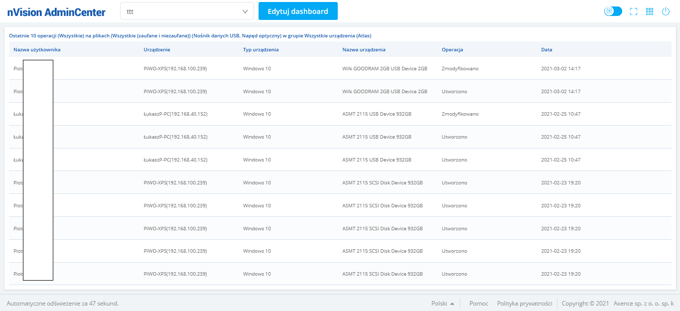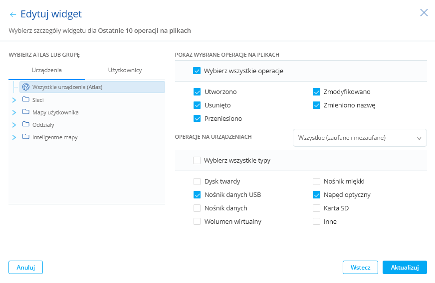 Ostatnie 10 operacji na plikach Widżet prezentuje listę ostatnich 10 operacji na plikach dla wybranego oddziału lub mapy. Konfiguracja wymaga od użytkownika wybrania oddziału lub mapy sieci, dla których zdarzenia mają być prezentowane. Możliwe jest również zawężenie wyników poprzez wybór rodzaju operacji na plikach (utworzono, zmodyfikowano, usunięto, przeniesiono lub zmieniono nazwę) oraz typów urządzeń przenośnych: