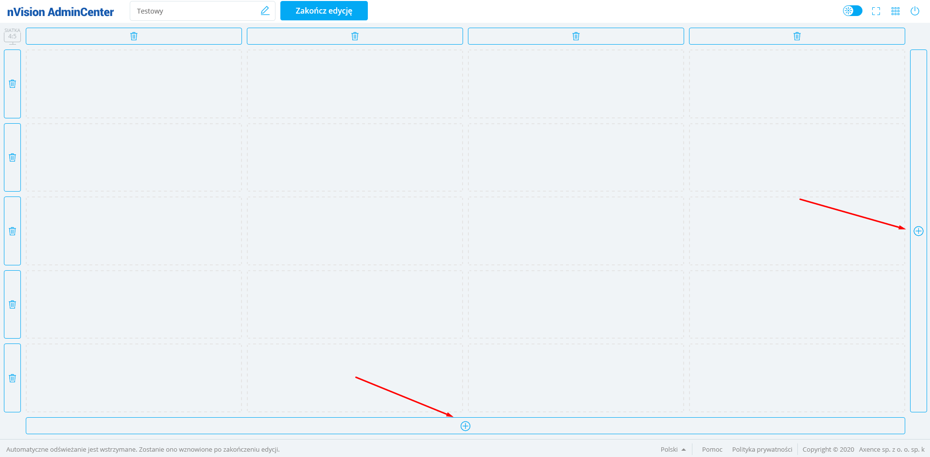 W celu dodania dodatkowych kolumn lub wierszy do siatki należy kliknąć przycisk "+" widoczny z dołu oraz po prawej stronie ekranu: