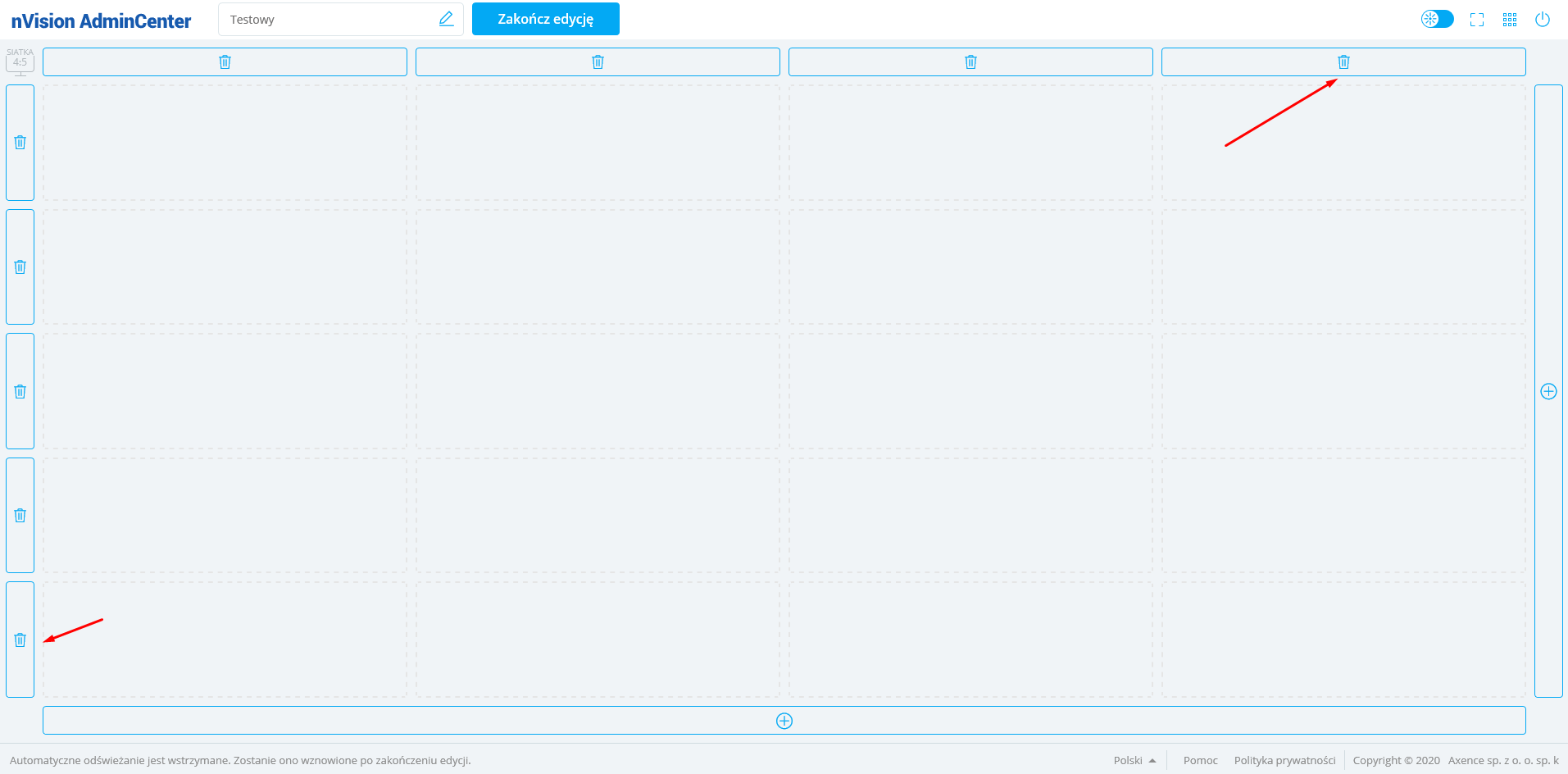 Aby zmiejszyć rozmiar dashboardu należy usunąć wiersz lub kolumnę poprzez kliknięcie ikony kosza znajdującej się przy poszczególnych pozycjach: |