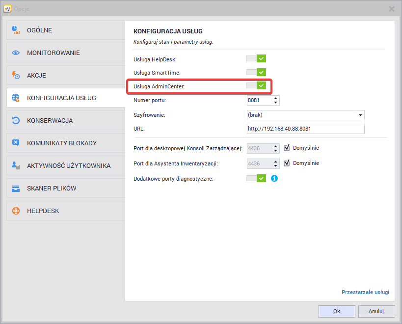 Aby włączyć AdminCenter, należy przejść do głównych ustawień programu nVision. W zakładce Konfiguracja usług można znaleźć przełącznik Stan usługi AdminCenter pozwalający na włączenie tej usługi: