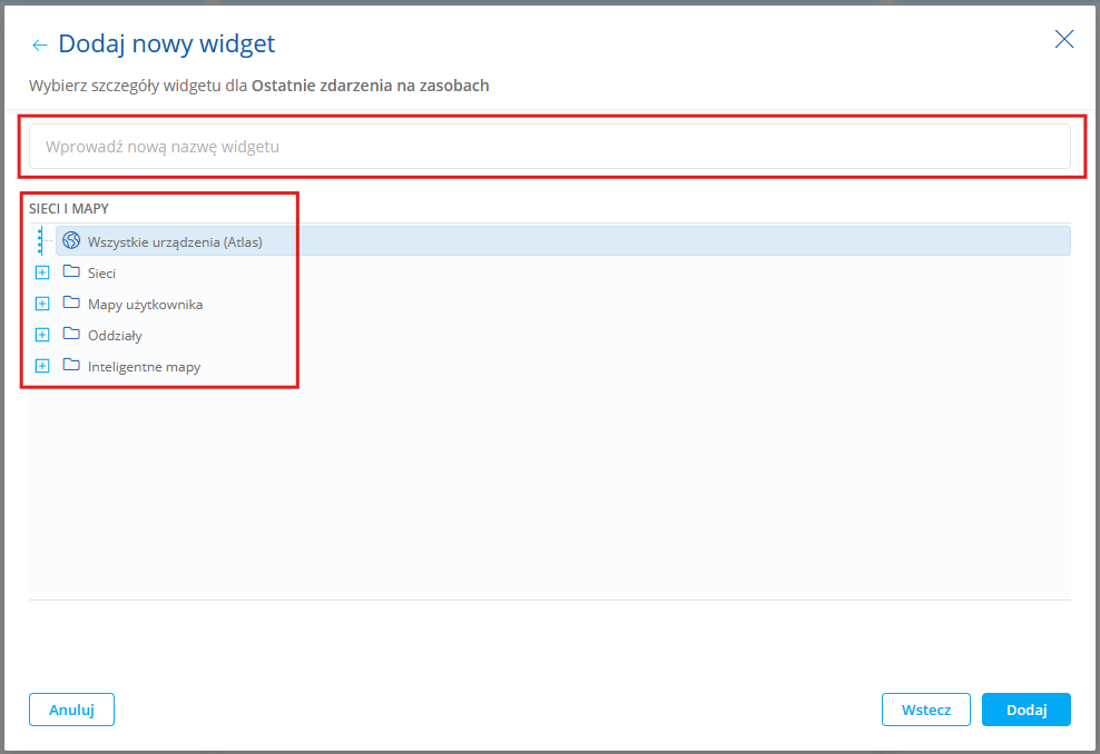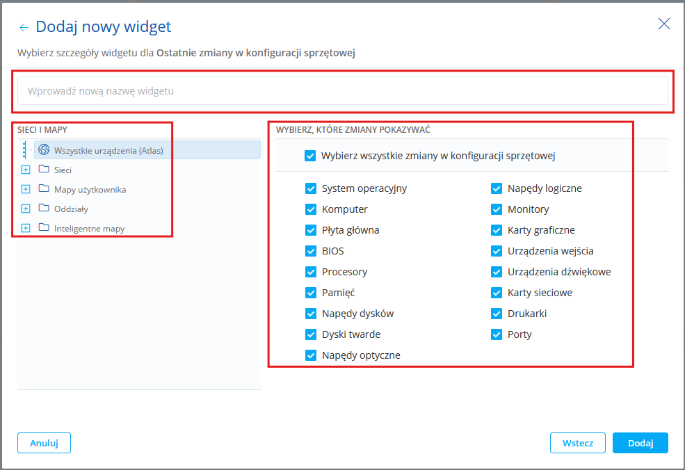 Ostatnie zmiany w konfiguracji sprzętowej Tabela zawierająca dane o zmianach w konfiguracji sprzętowej dla wybranej grupy urządzeń. Możesz wybrać: •mapę, •oddział, •podzespoły komputera.