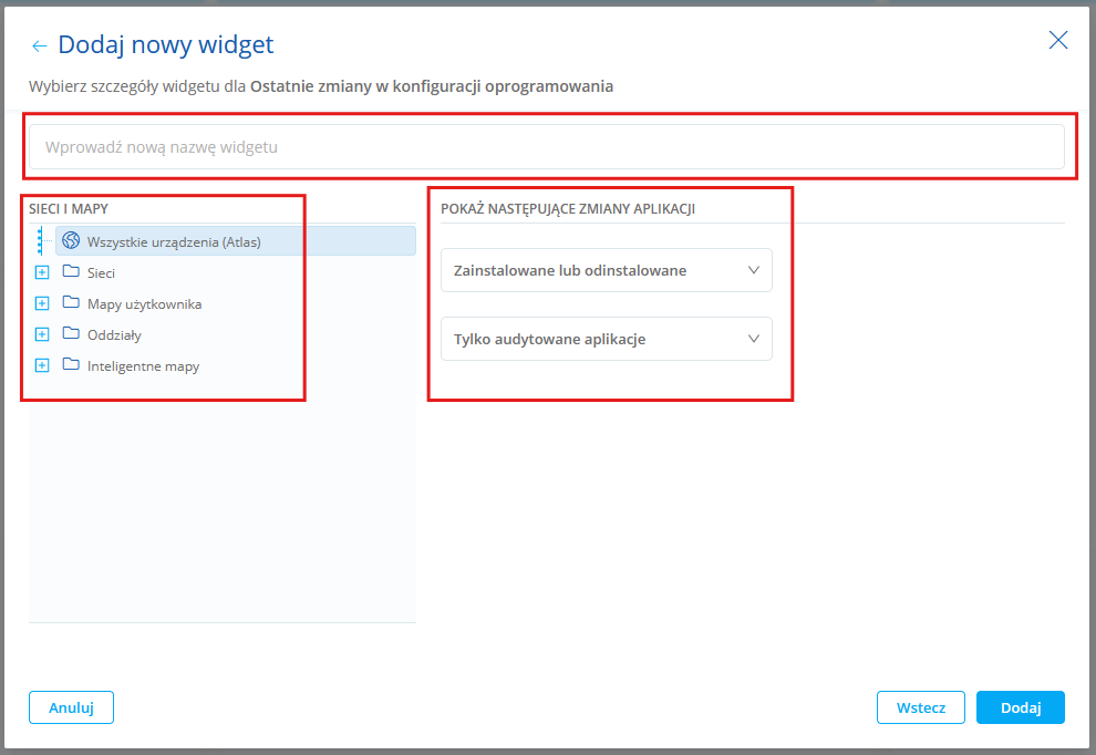 Ostatnie zmiany w konfiguracji oprogramowania Tabela zawierająca dane o zmianach w konfiguracji oprogramowania dla wybranej grupy urządzeń. Możesz wybrać: •mapę, •oddział, •operacje (zainstalowanie, odinstalowanie, zainstalowanie lub odinstalowanie), • rodzaj aplikacji (audytowane, nieaudytowane, wszystkie aplikacje).