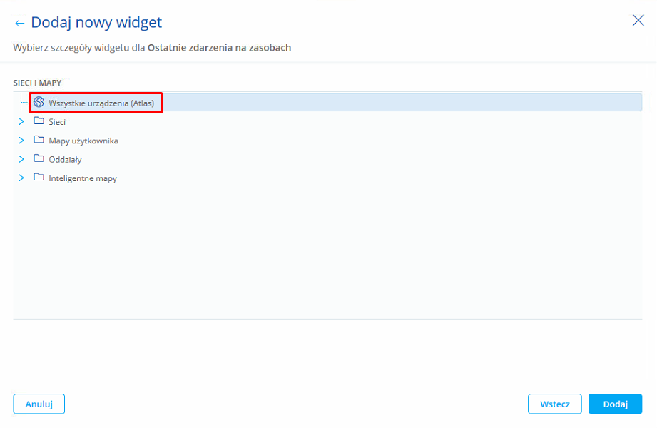 Ostatnie zdarzenia na zasobach Widżet umożliwia wyświetlenie tabeli przedstawiającej zdarzenia powiązane z zasobami (Zasoby / Zdarzenia w konsoli nVision). Konfiguracja wymaga od użytkownika wybrania mapy lub oddziału, dla którego prezentowane będą dane o zdarzeniach na zasobach: