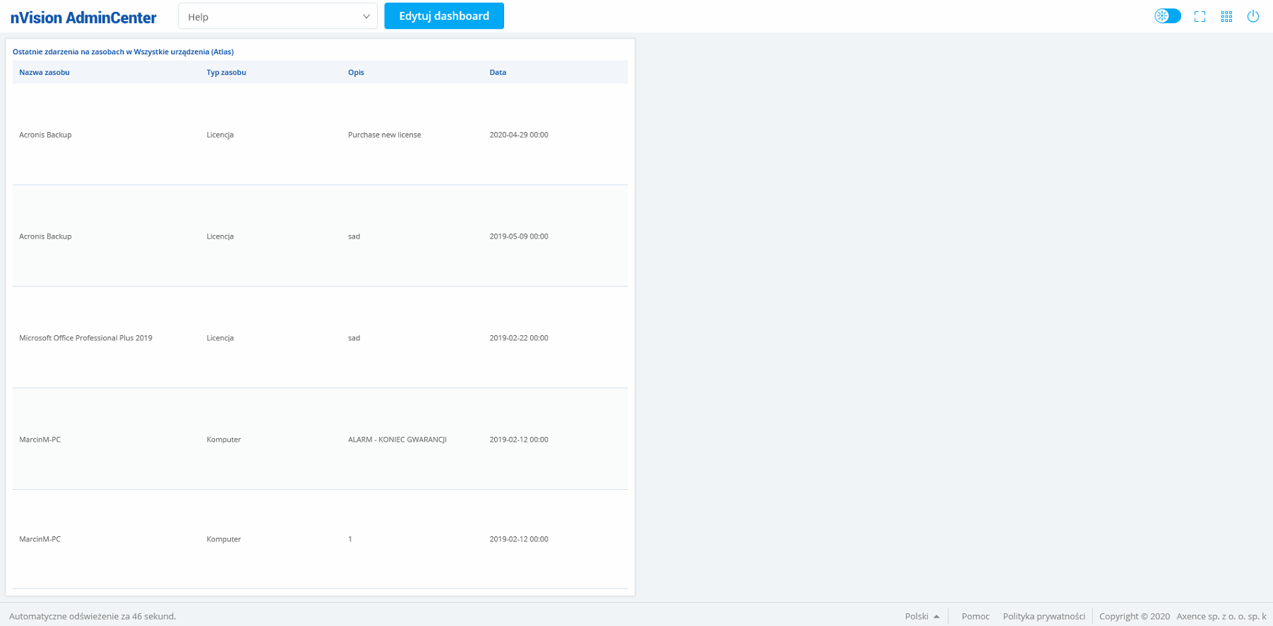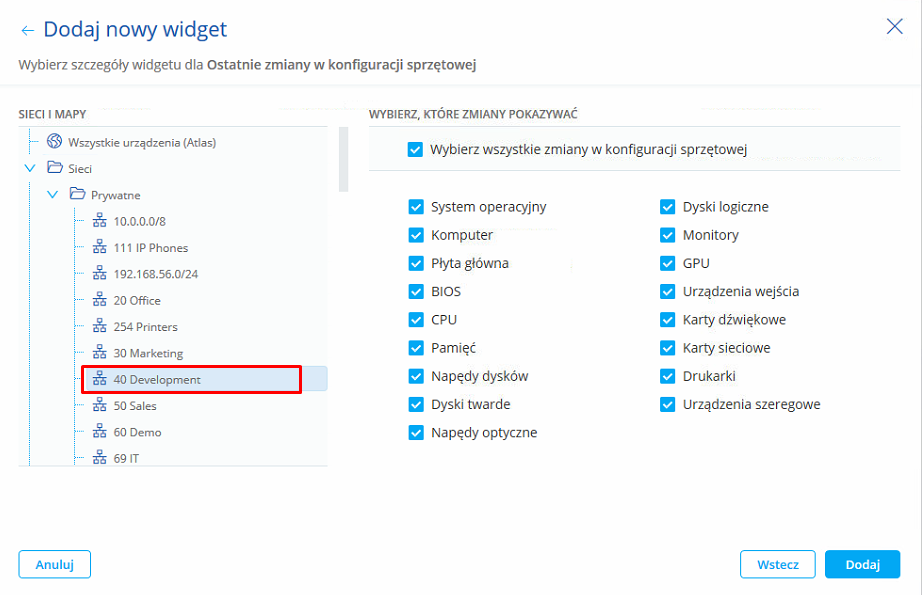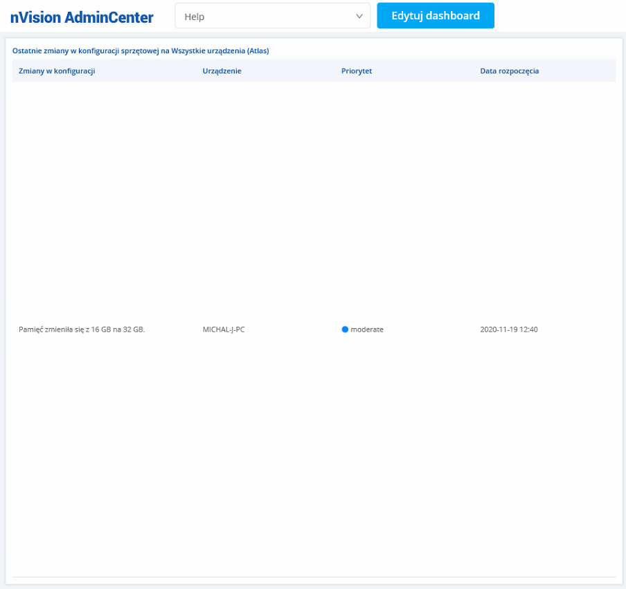 Ostatnie zmiany w konfiguracji sprzętowej Widżet umożliwia wyświetlenie tabeli przedstawiającej zmiany w konfiguracji sprzętowej dla wybranej grupy urządzeń. Konfiguracja wymaga od użytkownika wybrania mapy lub oddziału, dla którego prezentowane będą dane o zmianach w konfiguracji sprzętowej. Można również określić, które podzespoły komputera mają być uwzględnione w tym zestawieniu: