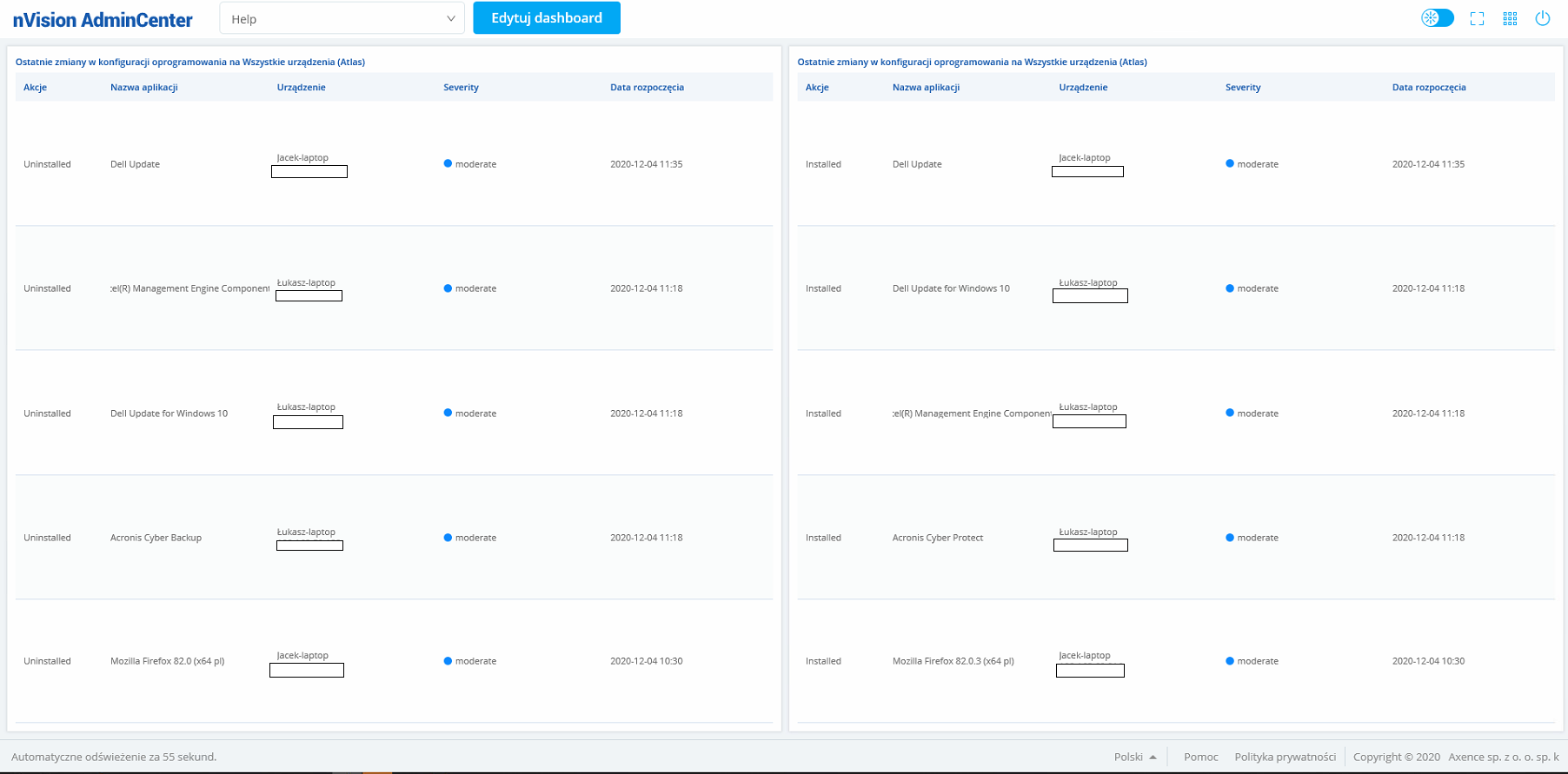 Ostatnie zmiany w konfiguracji oprogramowania Widżet umożliwia wyświetlenie tabeli przedstawiającej zmiany w konfiguracji oprogramowania dla wybranej grupy urządzeń. Konfiguracja wymaga od użytkownika wybrania mapy lub oddziału, dla którego prezentowane będą dane o zmianach w konfiguracji. Dodatkowo można określić jakie operacje mają być widoczne (zainstalowanie, odinstalowanie, zainstalowanie lub odinstalowanie) oraz wskazać rodzaj aplikacji zawartych w podsumowaniu (audytowane, nieaudytowane, wszystkie aplikacje):