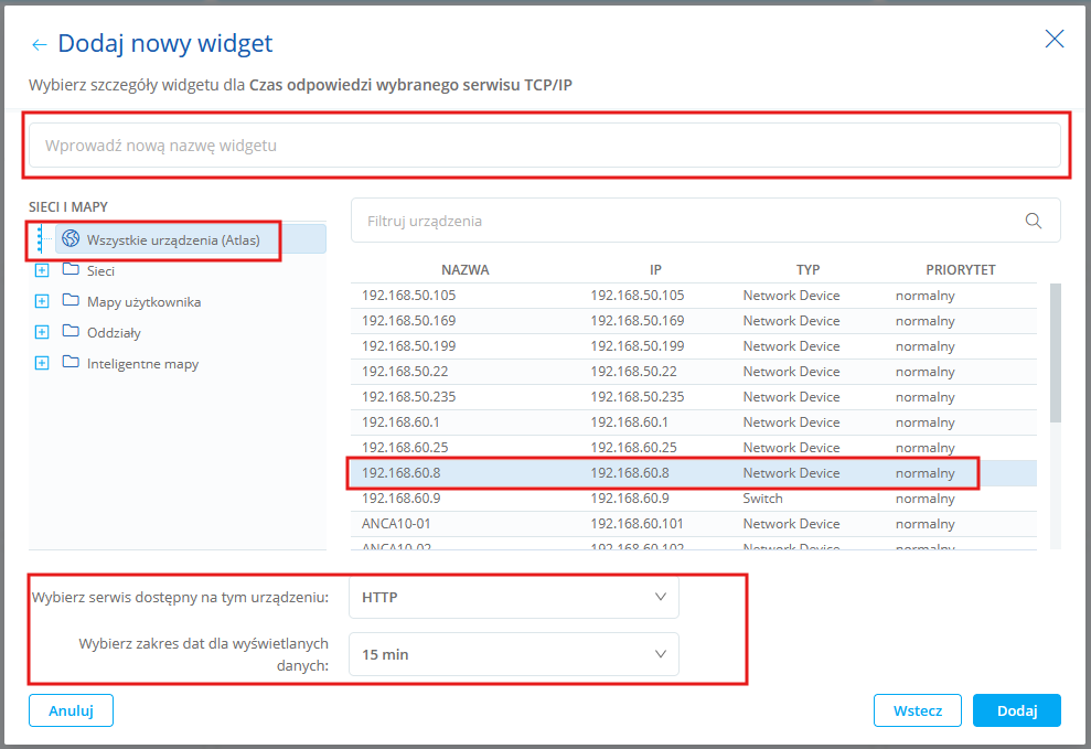 Uwaga! widget z czasem odpowiedzi serwisu TCP/IP dodasz tylko dla urządzeń z dodanym serwisem TCP/IP.