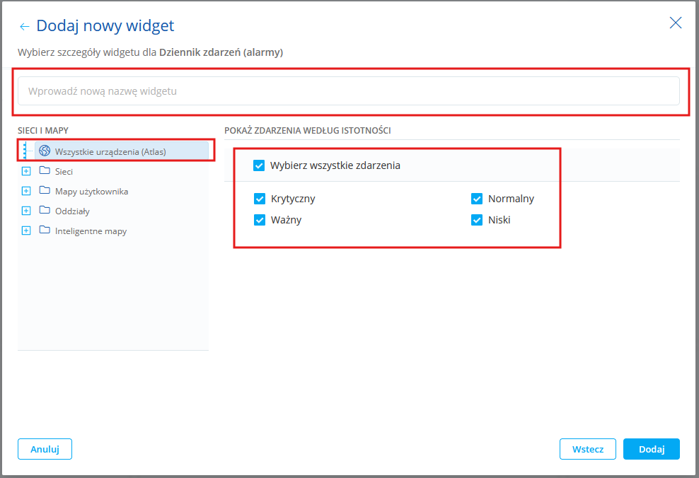 Dziennik zdarzeń (alarmy) Tabela zawierająca dane z dziennika zdarzeń (widocznego również w konsoli nVision). Możesz wybrać: •urządzenie, •poziom istotności zdarzeń.