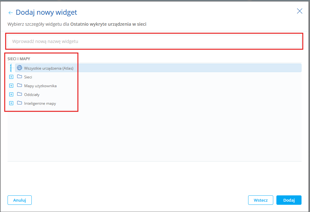 Ostatnio wykryte urządzenia w sieci Tabela zawierająca dane urządzeń ostatnio wykrytych w sieci. Możesz wybrać: •mapę sieci, •mapę oddziału. Przykład: