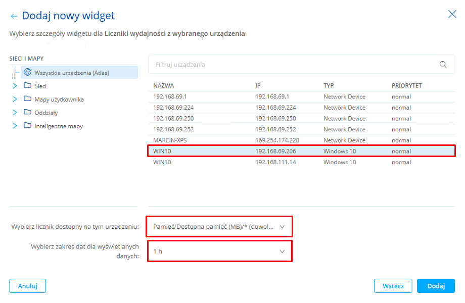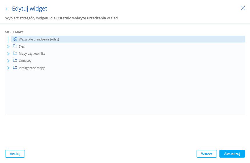 Ostatnio wykryte urządzenia w sieci Widżet umożliwia wyświetlenie ostatnio wykrytych urządzeń w sieci. Możliwe jest zawężenie wyników do konkretnej mapy sieci lub oddziału wybranego przez Administratora: