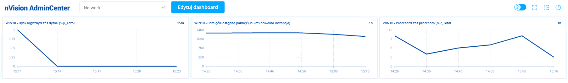Licznik wydajności wybranego urządzenia Widżet umożliwia wyświetlenie wykresu przedstawiającego wartości określonego licznika wydajności dla wybranego urządzenia. Konfiguracja wymaga od użytkownika wybrania urządzenia, licznika wydajności oraz zakresu czasu dla prezentowanych danych: