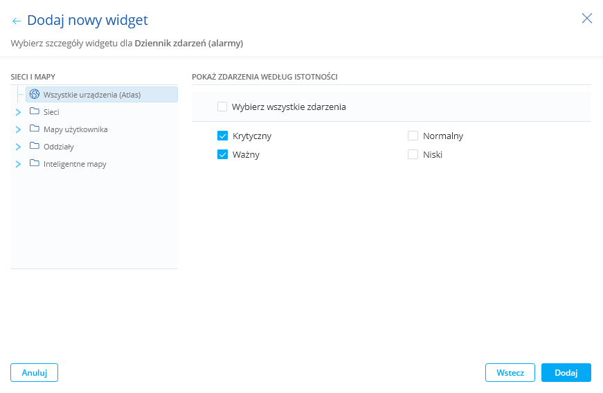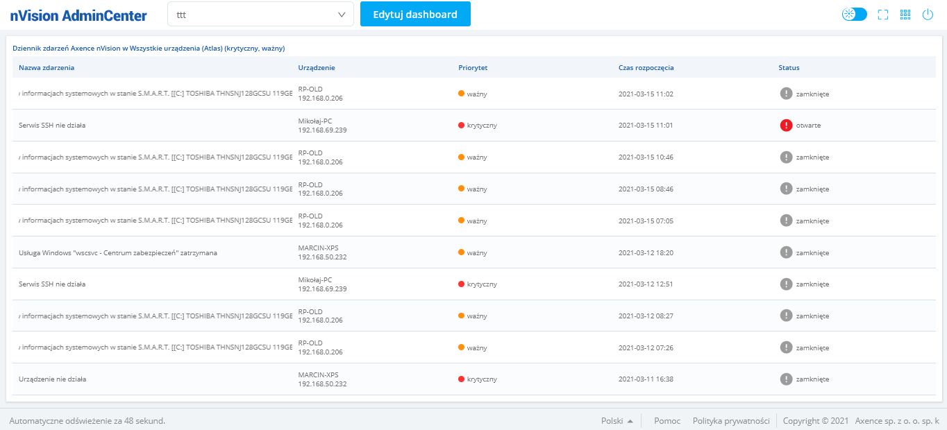 Dziennik zdarzeń (alarmy) Widżet umożliwia wyświetlenie tabeli przedstawiającej dziennik zdarzeń, który widoczny jest również w konsoli nVision. Administrator ma możliwość zawężenia wyświetlanych wyników w zależności od istotności zdarzenia: