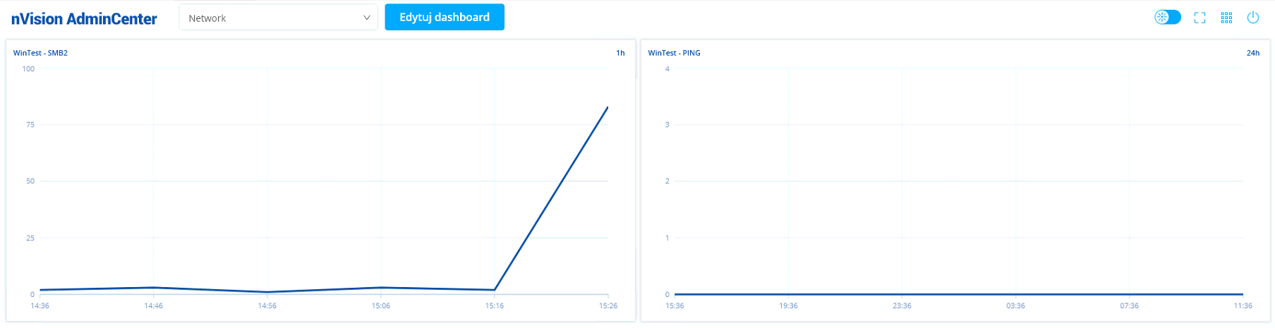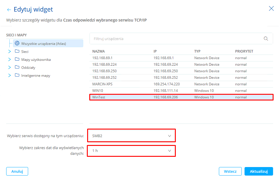Czas odpowiedzi wybranego serwisu TCP/IP Widżet umożliwia wyświetlenie wykresu przedstawiającego wartości odpowiedzi określonego serwisu TCP/IP dla wybranego urządzenia. Konfiguracja wymaga od użytkownika wybrania urządzenia, serwisu TCP/IP oraz zakresu czasu dla prezentowanych danych: