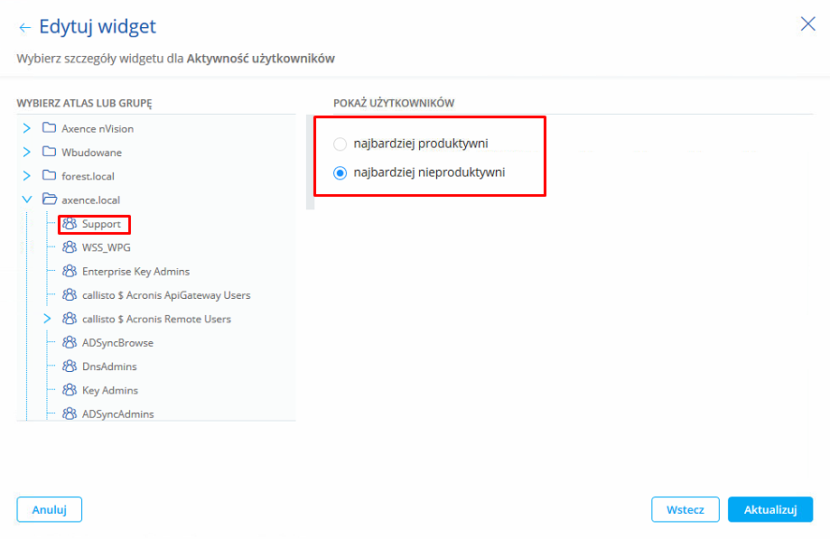 Aktywność użytkowników Widżet prezentuje tabelę dotyczącą aktywności i produktywności użytkowników z wybranej grupy. Konfiguracja wymaga od użytkownika wybrania grupy użytkowników oraz wskazania sposobu sortowania wyników (najbardziej produktywni lub najbardziej nieproduktywni użytkownicy):