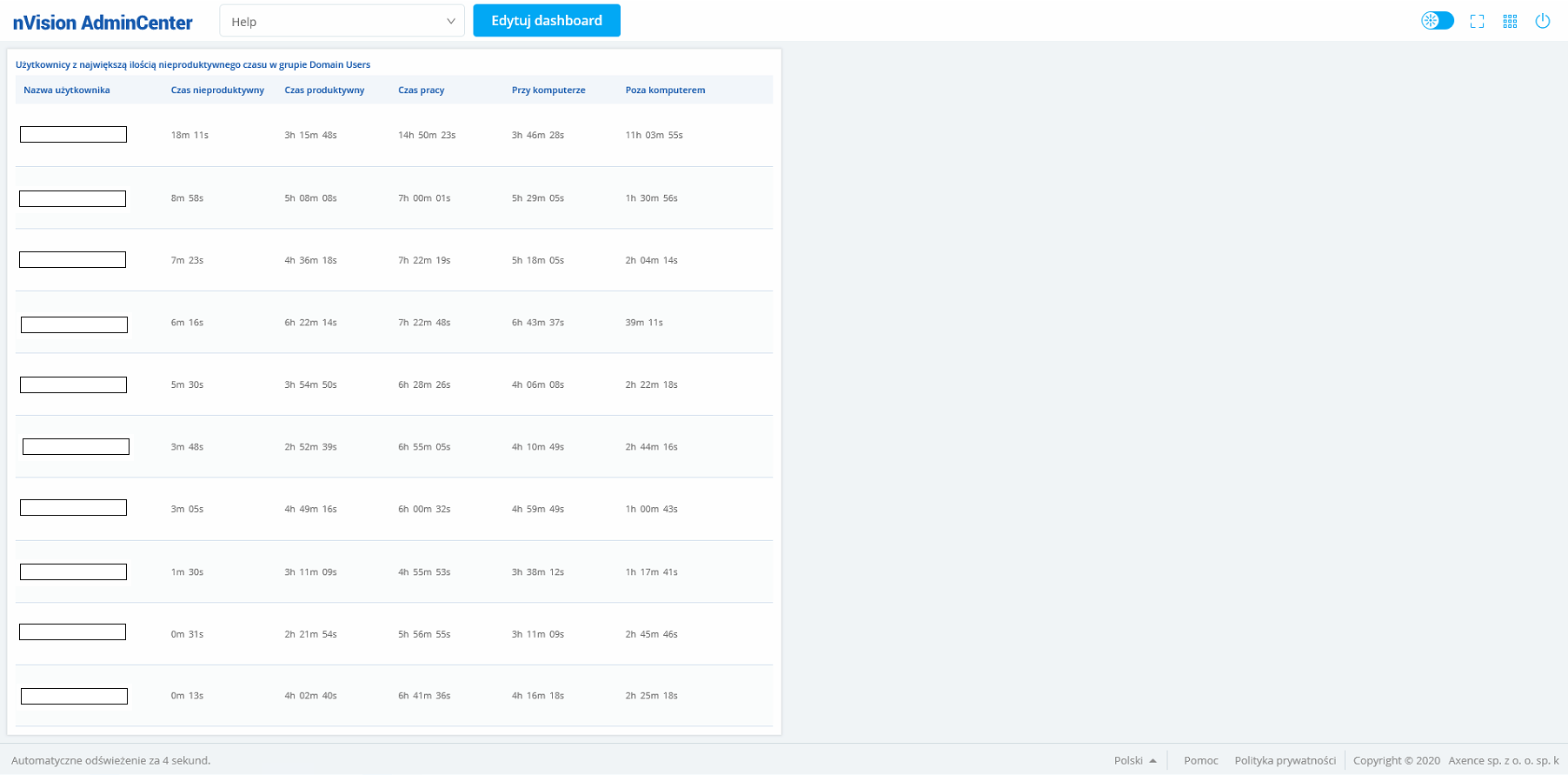 Użytkownicy z największą ilością czasu nieproduktywnego Widżet prezentuje tabelę pokazującą 10 osób z najdłuższym czasem nieproduktywności w wybranej grupie. Konfiguracja wymaga od użytkownika wskazania grupy użytkowników, dla której dane mają zostać zaprezentowane: