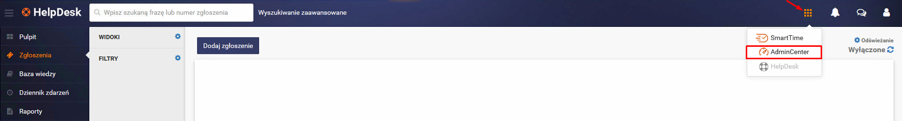 Uruchomienie z poziomu przeglądarki internetowej AdminCenter można również uruchomić z poziomu SmartTime lub HelpDesk. W górnej części okna przeglądarki znajduje się przycisk umożliwiający przełączanie się pomiędzy tymi portalami: |