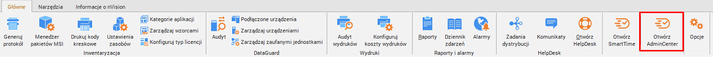 Uruchomienie z poziomu konsoli nVision Aby przejść do AdminCenter z konsoli nVision odnaleźć przycisk Otwórz AdminCenter na głównej wstążce nVision: