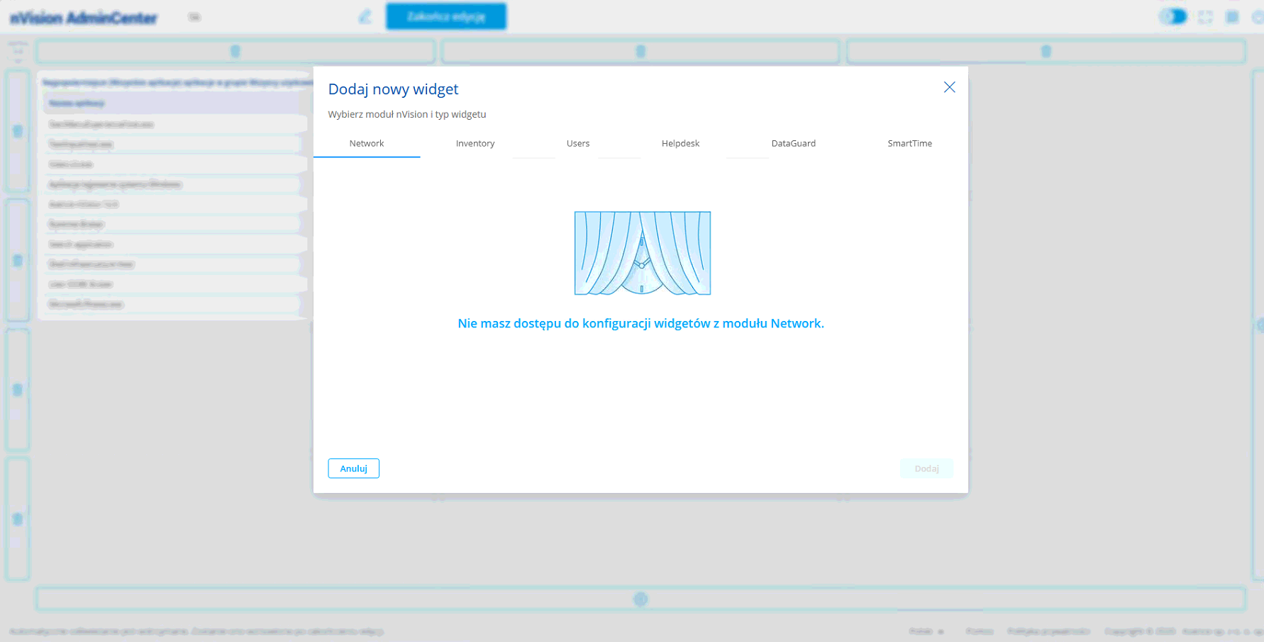 AdminCenter umożliwia wyświetlanie widżetów powiązanych z poszczególnymi modułami Axence nVision. Jeżeli zalogowany Administrator nie ma dostępu do zarządzania modułem lub modułu nie ma w licencji programu, to nie będzie on mógł tworzyć widżetów pochodzących z tego modułu. Informacja ta zostanie zaprezentowana w AdminCenter: