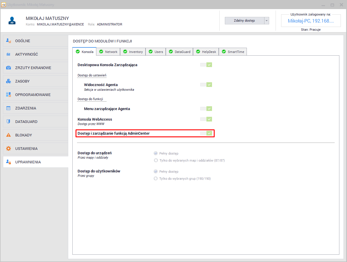 Jeżeli użytkownik posiada rolę Operatora, to należy określić, czy może mieć dostęp do funkcjonalności AdminCenter. Aby to zrobić, należy przejść do okna informacji o użytkowniku, a następnie wybrać zakładkę Uprawnienia / Konsola i włączyć opcję "dostęp i zarządzanie funkcją AdminCenter":