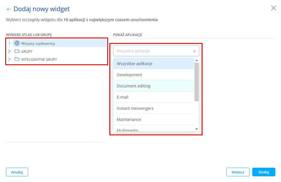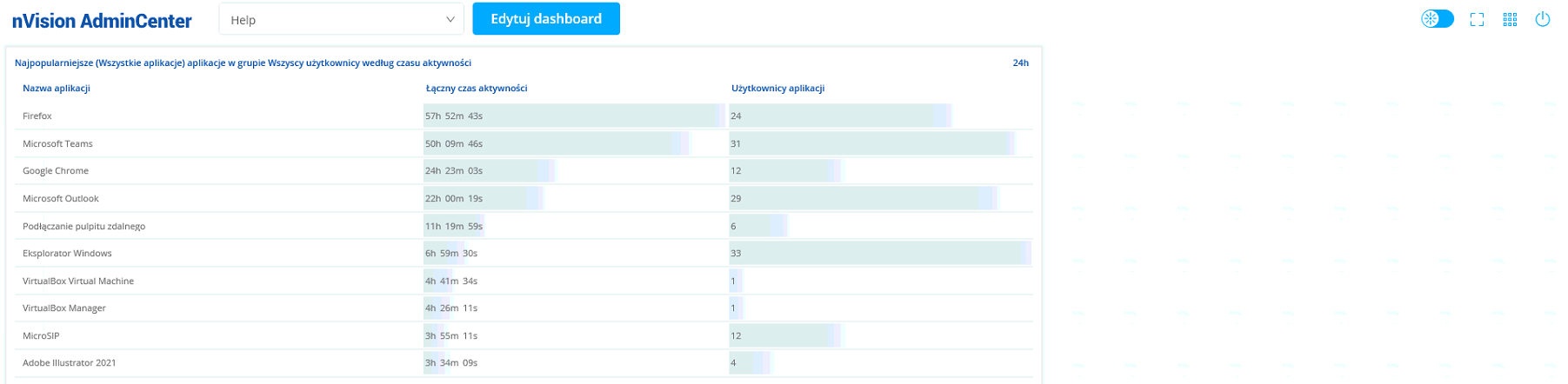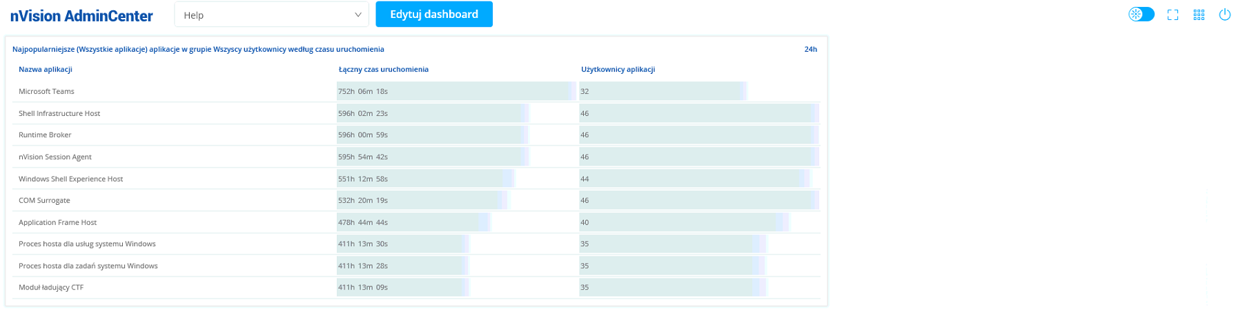 10 aplikacji z największym czasem uruchomienia Widżet prezentuje 10 aplikacji z najdłuższym czasem uruchomienia dla wybranej grupy użytkowników. Konfiguracja wymaga od użytkownika wybrania grupy użytkowników oraz kategorii aplikacji. Kategorie aplikacji można modyfikować w głównych opcjach nVision w zakładce Aktywność użytkowników / Aplikacje.