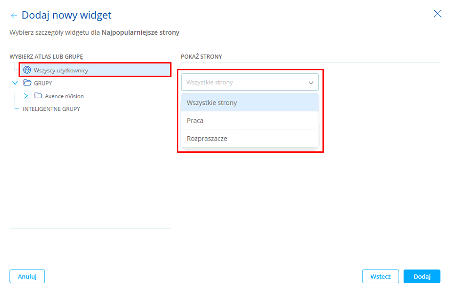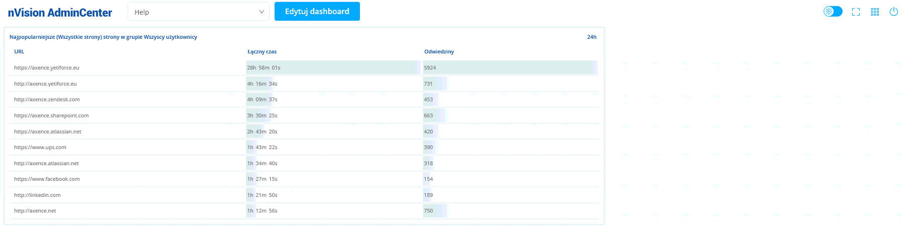 Najpopularniejsze strony Widżet prezentuje najpopularniejsze strony internetowe dla wybranej grupy użytkowników za okres ostatnich 24 godzin. Konfiguracja wymaga od użytkownika wybrania grupy użytkowników oraz kategorii stron internetowych. Kategorie stron internetowych można modyfikować w głównych opcjach nVision w zakładce Aktywność użytkowników / Domeny.