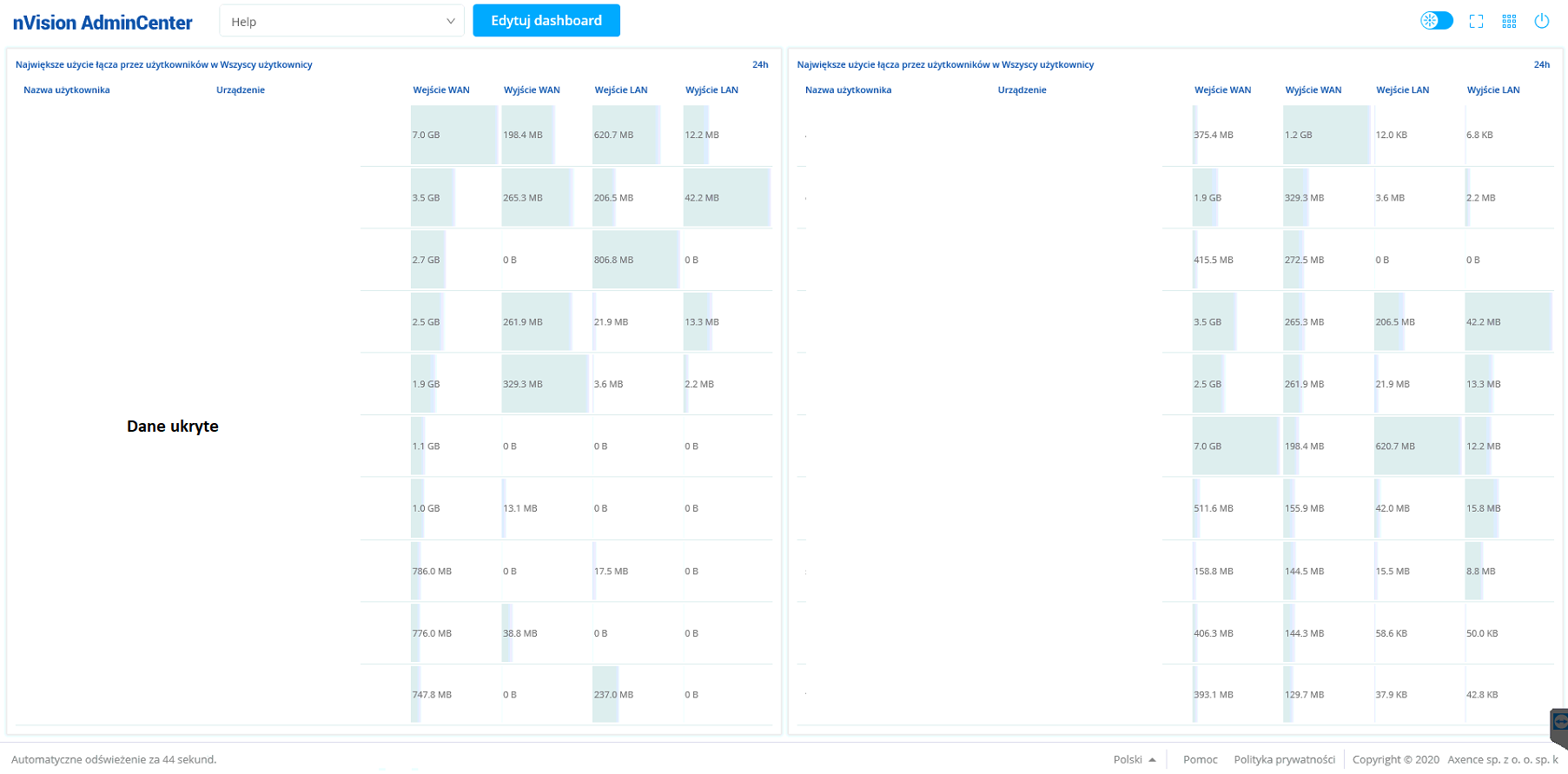 Największe użycie łącza przez użytkowników Widżet prezentuje statystyki zużycia łącza przez użytkowników w okresie ostatnich 24 godzin. Konfiguracja wymaga od użytkownika wybrania grupy użytkowników dla której będą prezentowane dane oraz wskazania kolumny, po której wyniki zostaną posortowane:
