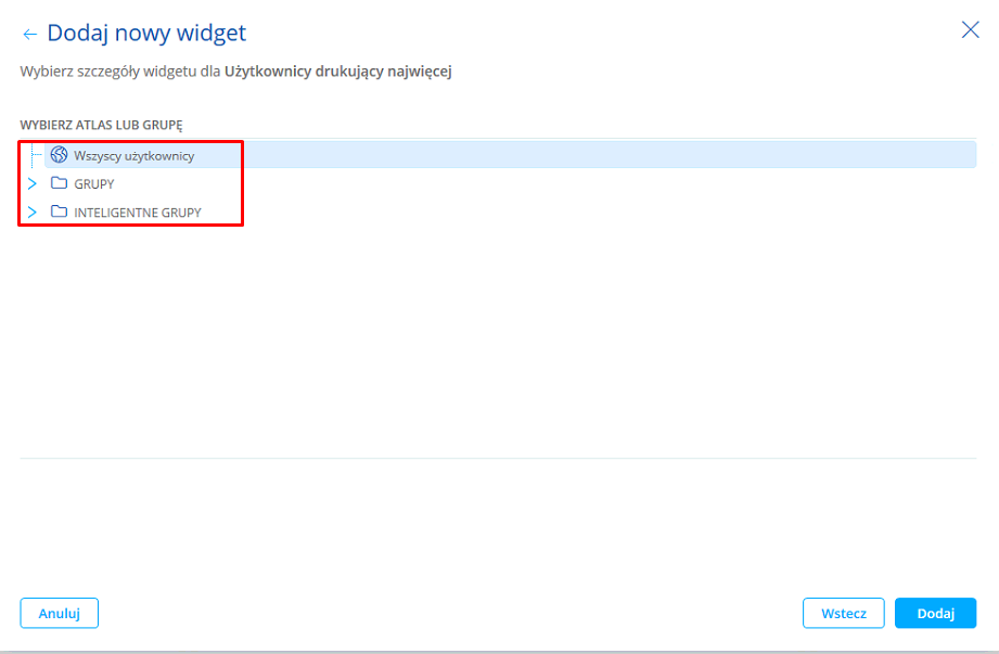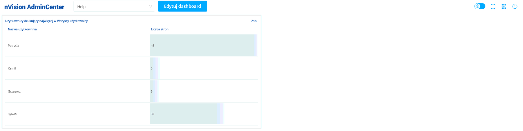 Użytkownicy drukujący najwięcej Widżet prezentuje listę użytkowników, którzy wykonali najwięcej wydruków w okresie ostatnich 24 godzin. Konfiguracja wymaga od użytkownika wybrania grupy użytkowników dla której będą prezentowane dane.
