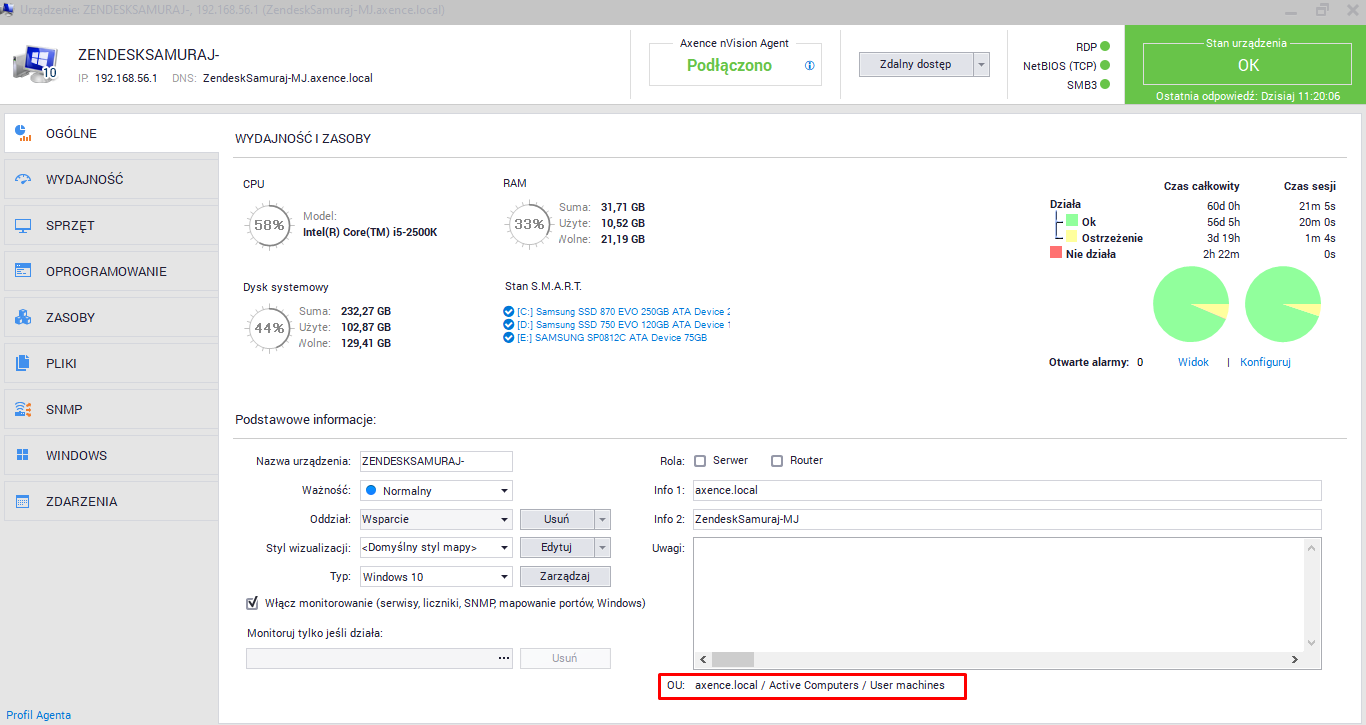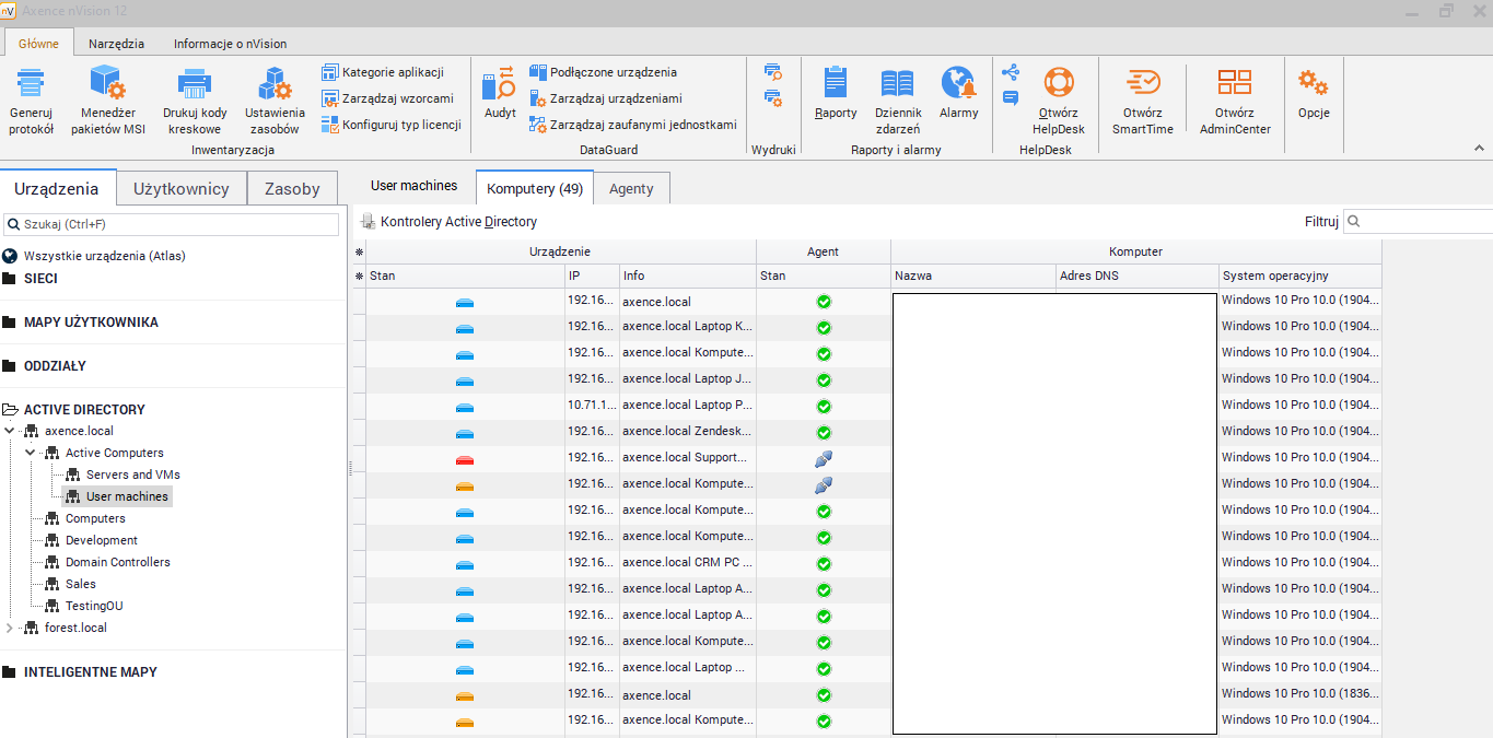 Dodawanie kontrolera domeny zostało opisane w kolejnym rozdziale. Po udanej synchronizacji z domeną zostaną pobrane informacje o jednostkach organizacyjnych, do których należą urządzenia dodane do domeny: