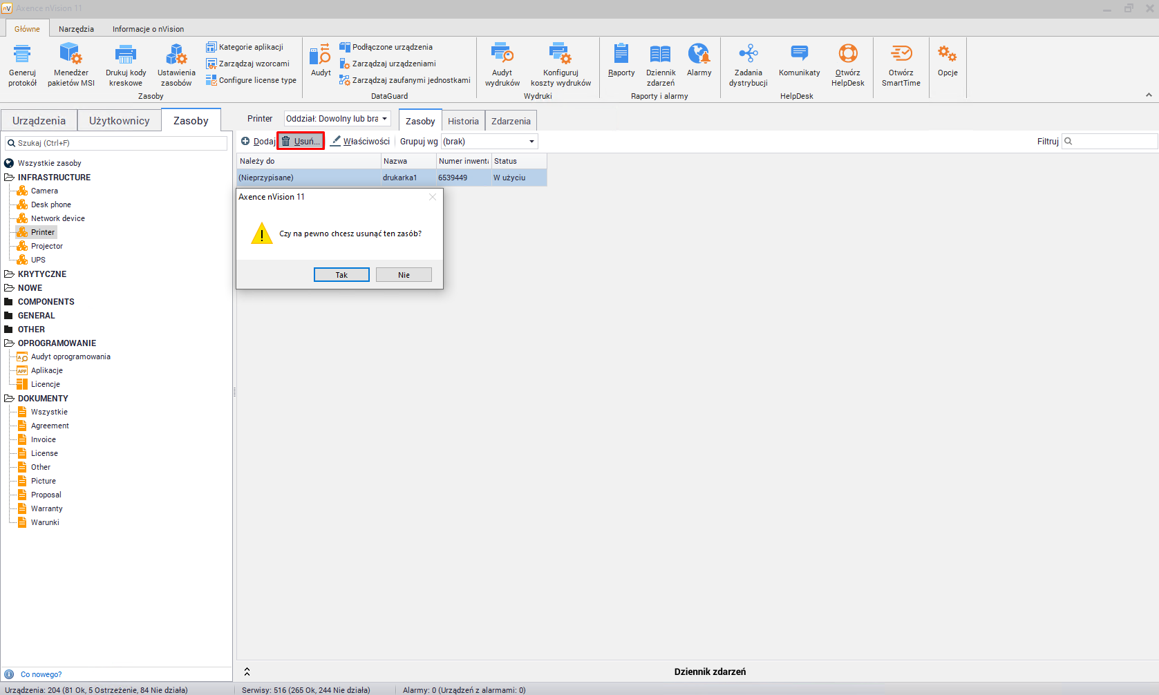 Usuwanie zasobu W celu usunięcia zasobu należy przejść do zakładki Zasoby dostępnej z poziomu głównego okna programu. Po odszukaniu zasobu na liście należy kliknąć przycisk Usuń lub wybrać analogiczną opcję z menu kontekstowego: |