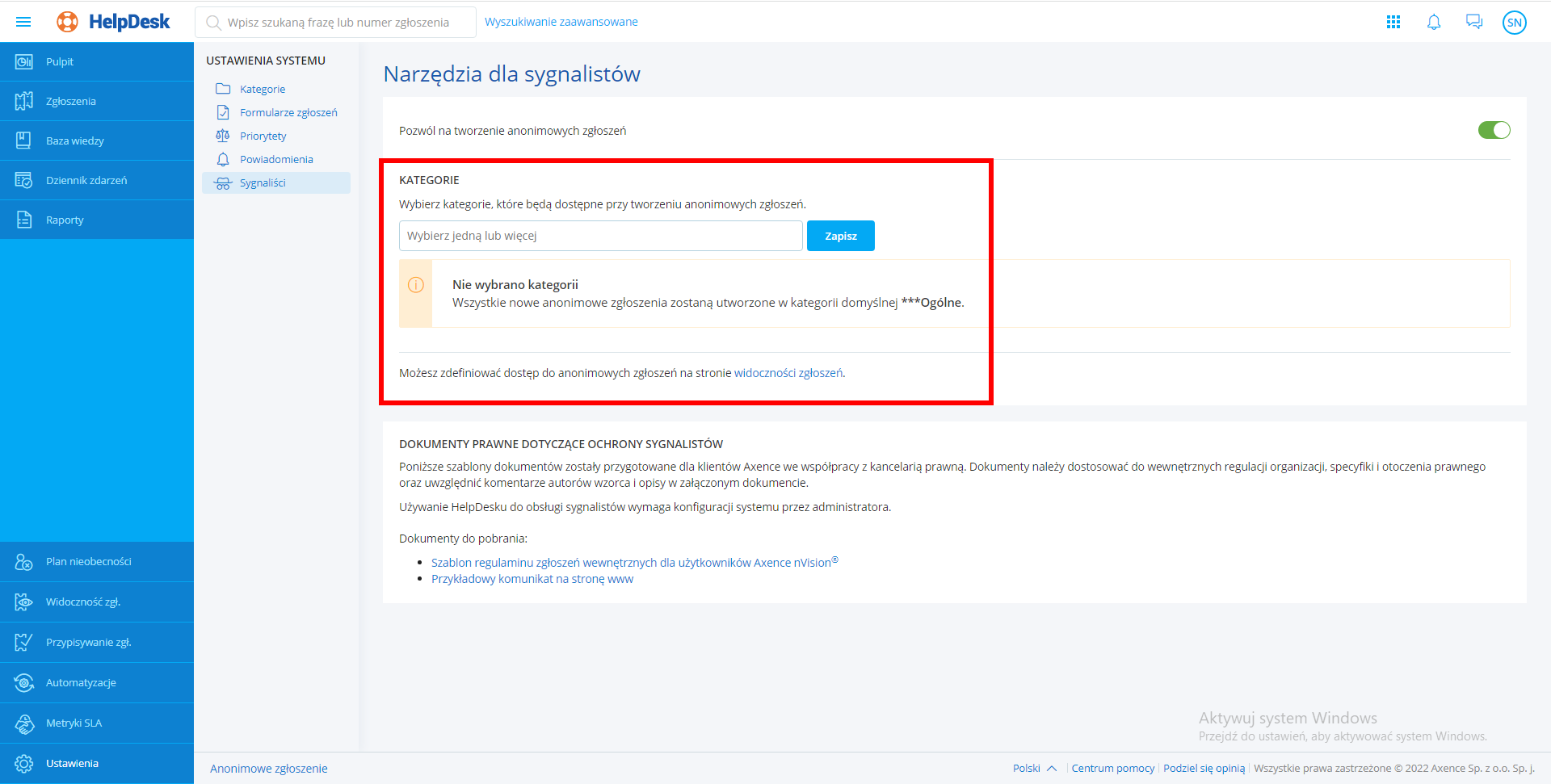 Konfigurując ustawienia anonimowych zgłoszeń należy pamiętać o tym, by wybrać odpowiednią kategorię, do której przypisywane będą anonimowe zgłoszenia.