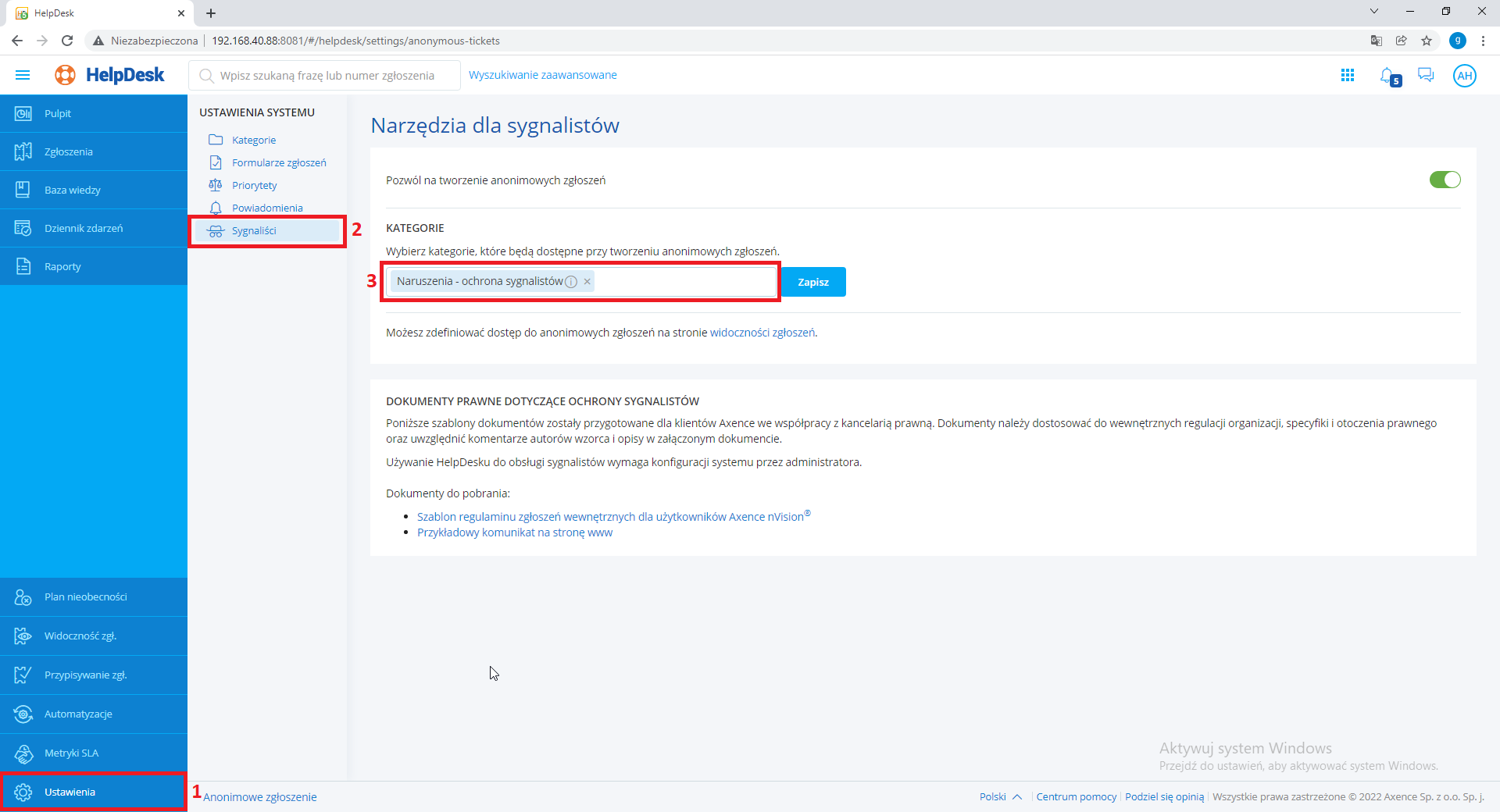 Aby wybrać kategorie, które będą dostępne przy tworzeniu anonimowych zgłoszeń należy zalogować się jako Administrator do modułu HelpDesk oraz: 1. Z wysuwanego menu z lewej strony okna, kliknąć w Ustawienia. 2. Wejść w ustawienia sygnalistów - Sygnaliści. 3. Kliknąć w pole znajdujące się po lewej od przycisku Zapisz. Po kliknięciu rozwinie się lista wszystkich kategorii istniejących w HelpDesku. Wybierz kategorię (możesz wybrać więcej niż jedną kategorię), a następnie potwierdź swój wybór klikając w przycisk Zapisz.