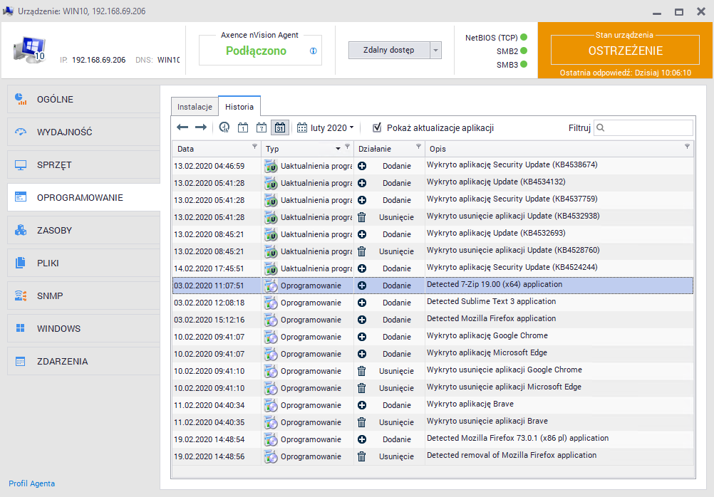 Historia instalacji wybranego hosta Przechodząc do okna Informacji o urządzeniu, a następnie do zakładki Oprogramowanie / Historia możliwe jest zobaczenie historii instalacji wybranego hosta: |