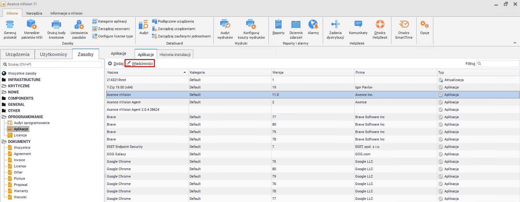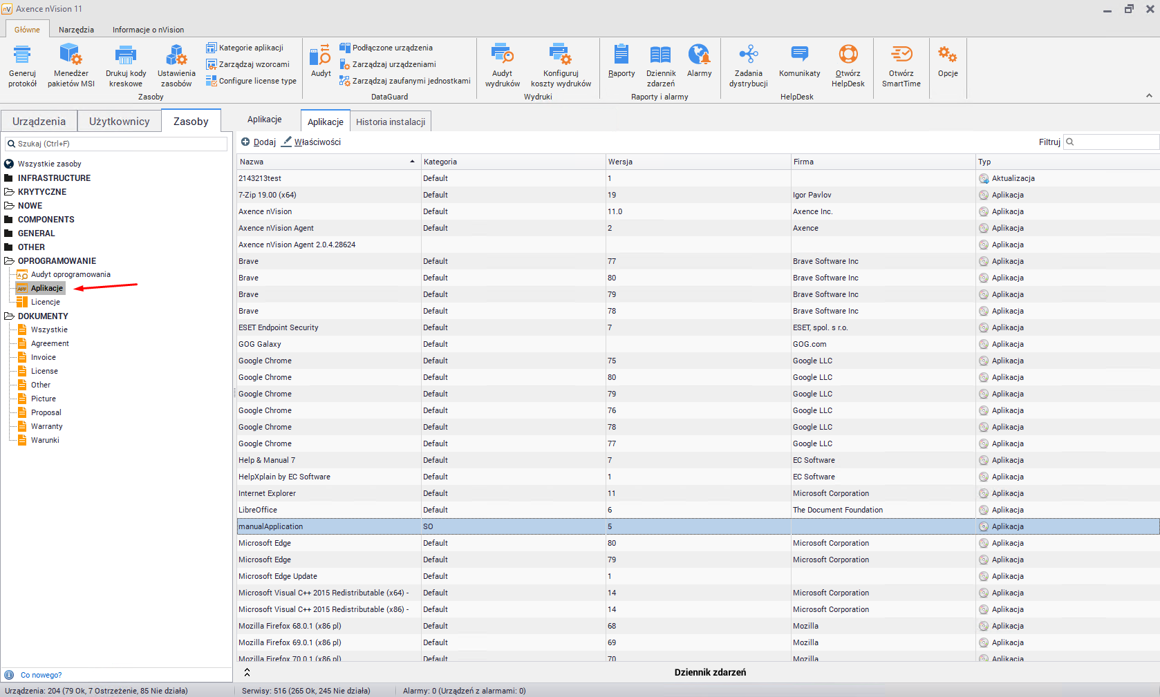 Aby wyświetlić listę aplikacji wybierz zakładkę Zasoby widoczną w głównym oknie programu, a następnie odszukaj pozycję Aplikacje w sekcji Oprogramowania: