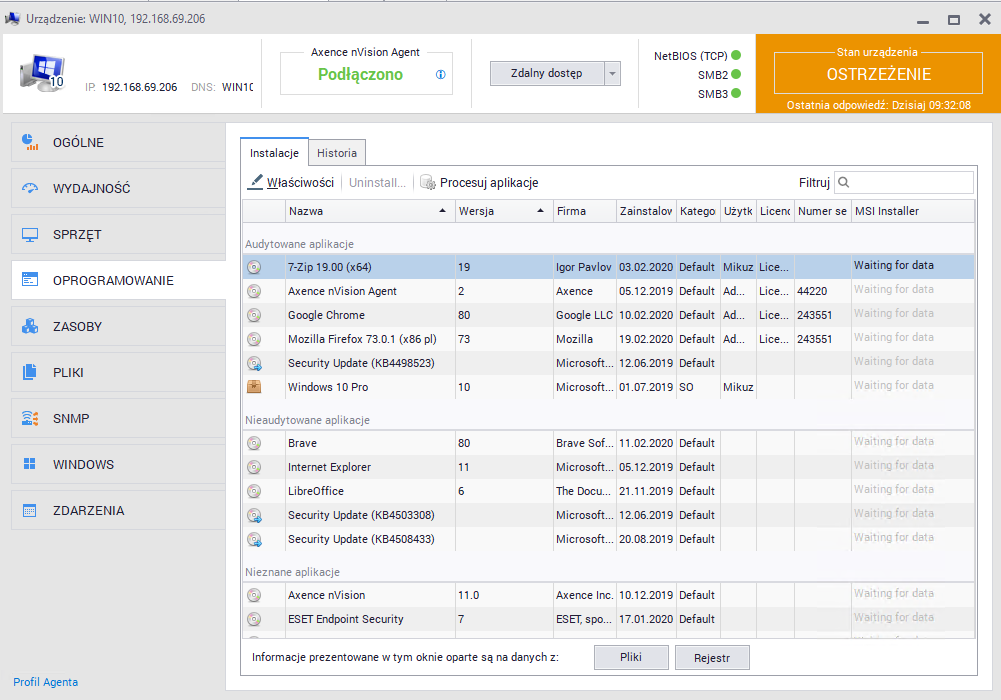 Aplikacje na wybranym hoście Przechodząc do okna Informacji o urządzeniu, a następnie do zakładki Oprogramowanie / Instalacje możliwe jest zobaczenie listy aplikacji zainstalowanych na wybranym hoście: