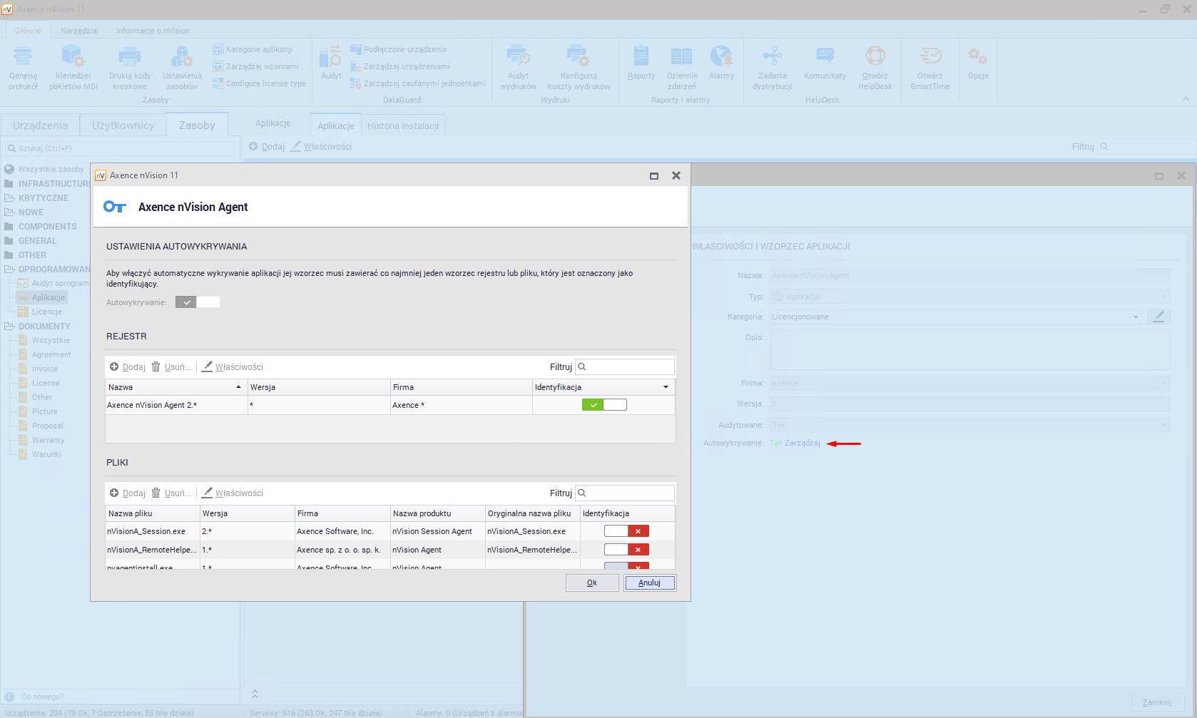 Po kliknięciu w przycisk Zarządzaj znajdujący się przy pozycji Autowykrywanie zostanie otwarte okno ustawień automatycznego wykrywania instalacji. Aby włączyć automatyczne wykrywanie aplikacji jej wzorzec musi zawierać co najmniej jeden wpis rejestru lub pliku, który oznaczony jest jako identyfikujący: