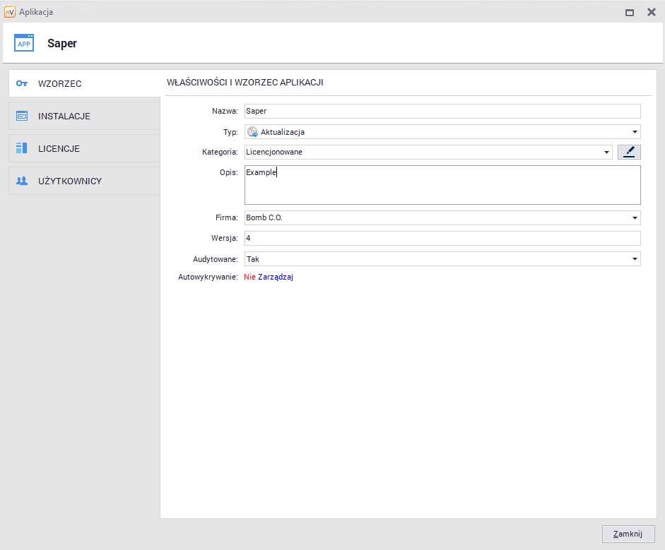 Wzorzec aplikacji Przechodząc do zakładki Zasoby widocznej w głównym oknie programu, a następnie klikając dwukrotnie na dowolną pozycję na liście Aplikacji w sekcji Oprogramowania możliwa jest edycja aplikacji. Pierwszą z dostępnych zakładek jest wzorzec, który definiuje podstawowe informacje o aplikacji: Aplikacja posiada następujące właściwości: •Nazwa, •Typ, •Audytowane, •Kategoria, •Producent (opcjonalnie), •Wersja (opcjonalnie), •Opis (opcjonalnie), •Autowykrywanie.
