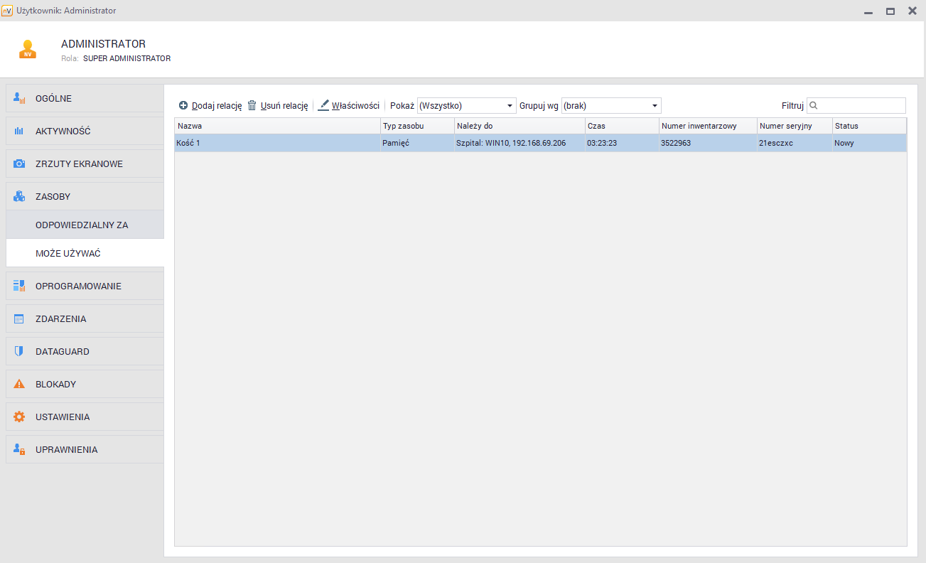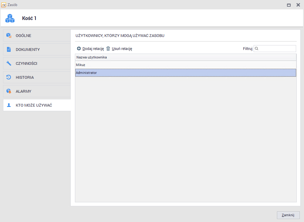 Zakładka Kto może używać prezentuje informacje o użytkownikach, którzy mają dostęp do wybranego zasobu, ale niekoniecznie są za niego odpowiedzialni. Każdy zasób może mieć dowolnie wiele użytkowników, którzy go używają. Relacja ta ma jedynie charakter pomocniczy - nie nadaje ona żadnych dostępów ani uprawnień dla użytkowników ustawionych jako używający zasobu.
