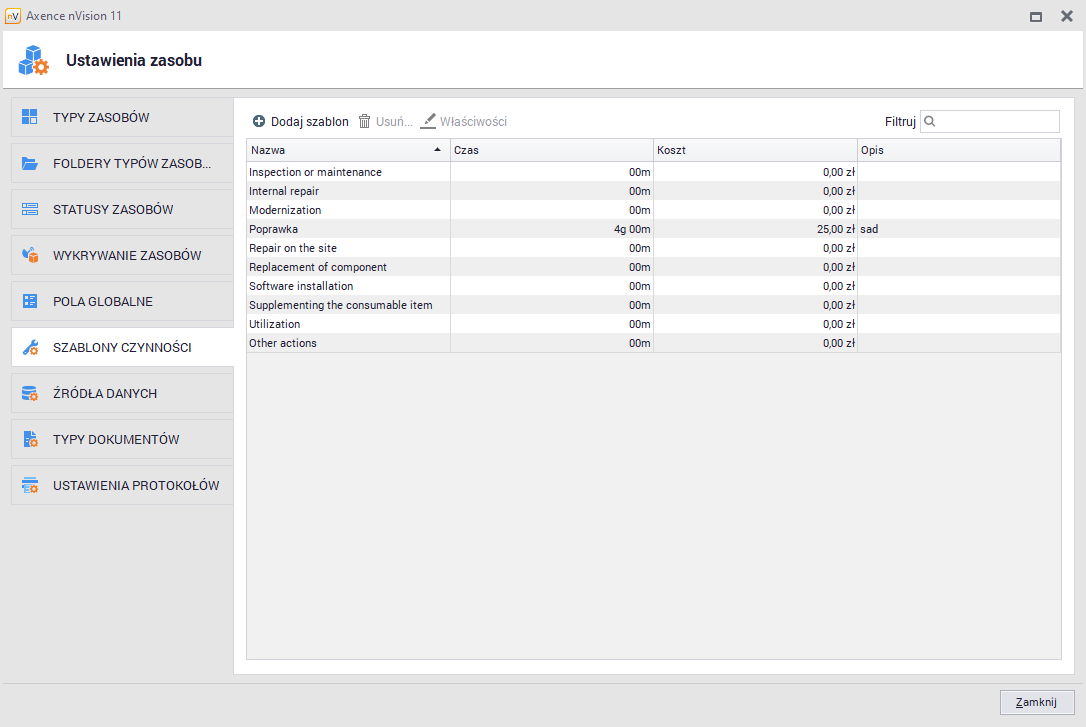 Funkcjonalność dodawania czynności dla zasobu pozwala na dodanie, wyświetlenie i usunięcie czynności wykonanych na wybranym zasobie. Dzięki temu, możliwe jest precyzyjne opisanie kosztu i działań wykonanych na poszczególnych zasobach. Szablony czynności pozwalają administratorowi na zdefiniowanie szeregu czynności, które mogą być wykonywane na zasobie. Korzystając z szablonów przypisanie czynności do zasobu zajmuje kilka sekund oraz daje możliwość szybkiej edycji (np. kosztu) w momencie dodawania.