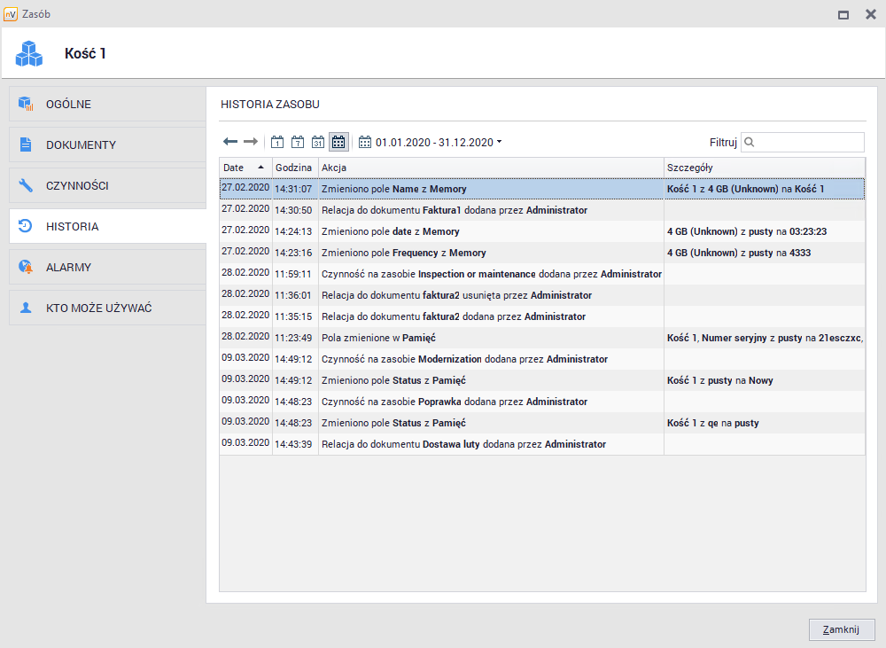 Zakładka Historia w oknie edycji zasobu umożliwia zobaczenie listy wszystkich zmian wykonanych na wybranym zasobie. Wpisy będą uwzględniały datę, opis oraz osobę, która dokonała zmiany: Aby zobaczyć historię zmian dla wszystkich zasobów należy przejść do zakładki Zasoby w głównym oknie programu, a następnie wybrać pozycję Wszystkie zasoby / Historia: |