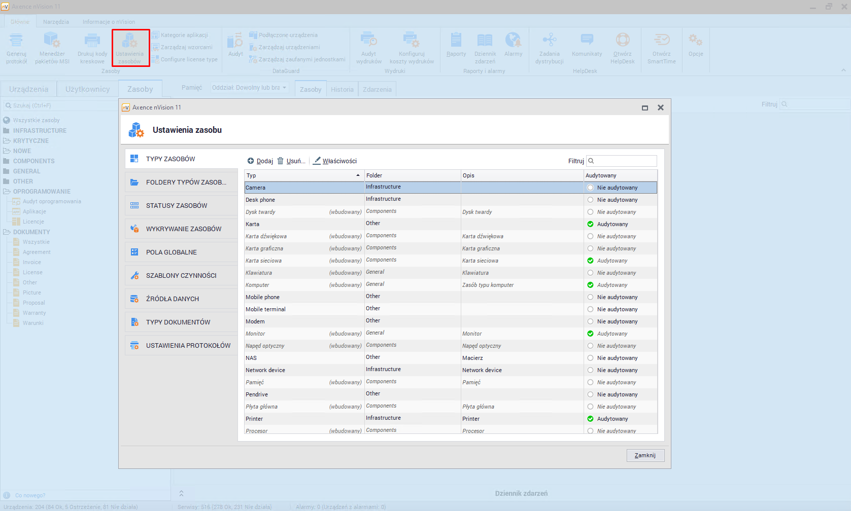 Okno ustawień zostało podzielone na kilka zakładek. Należą do nich: •Typy zasobów, •Foldery typów zasobów, •Statusy zasobów, •Wykrywanie zasobów, •Pola globalne, •Szablony czynności, •Źródła danych, •Typy dokumentów, •Ustawienia protokołów.